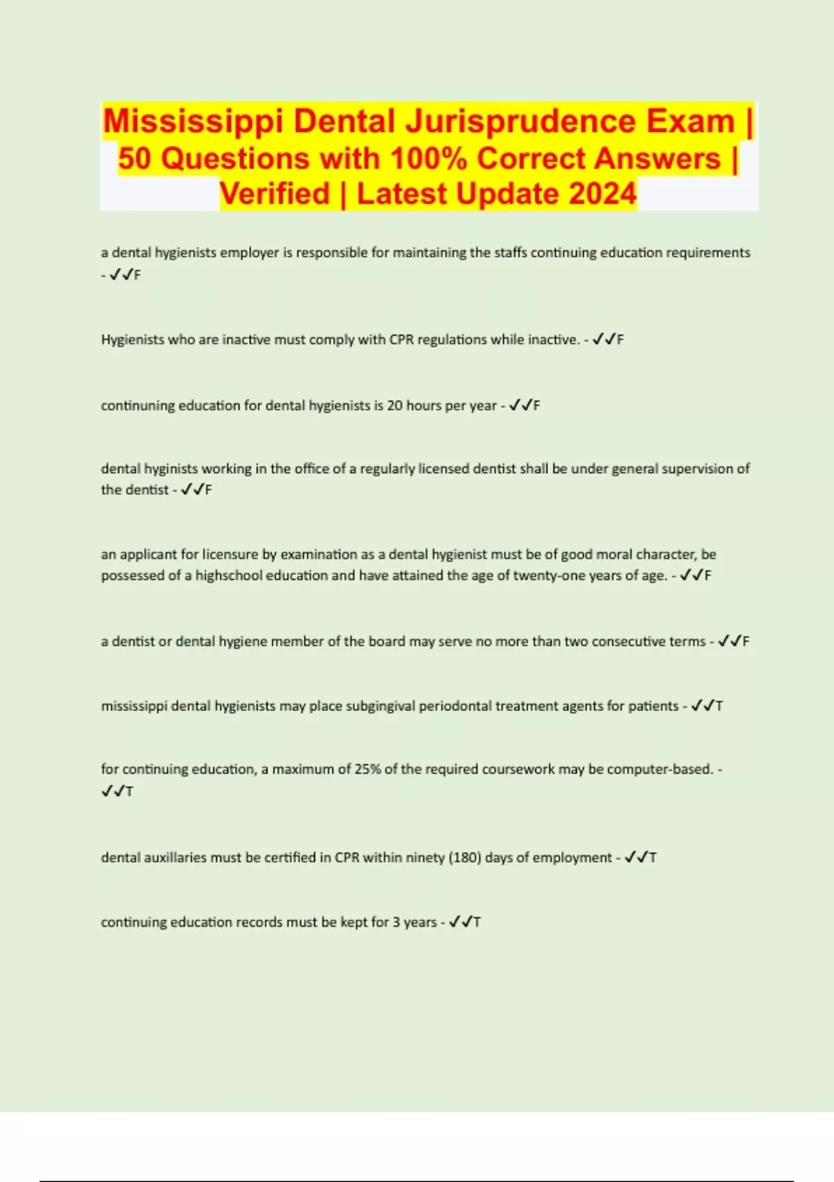 Mississippi Dental Jurisprudence Exam | 50 Questions with 100% Correct Answers | Verified | Latest Update 2024