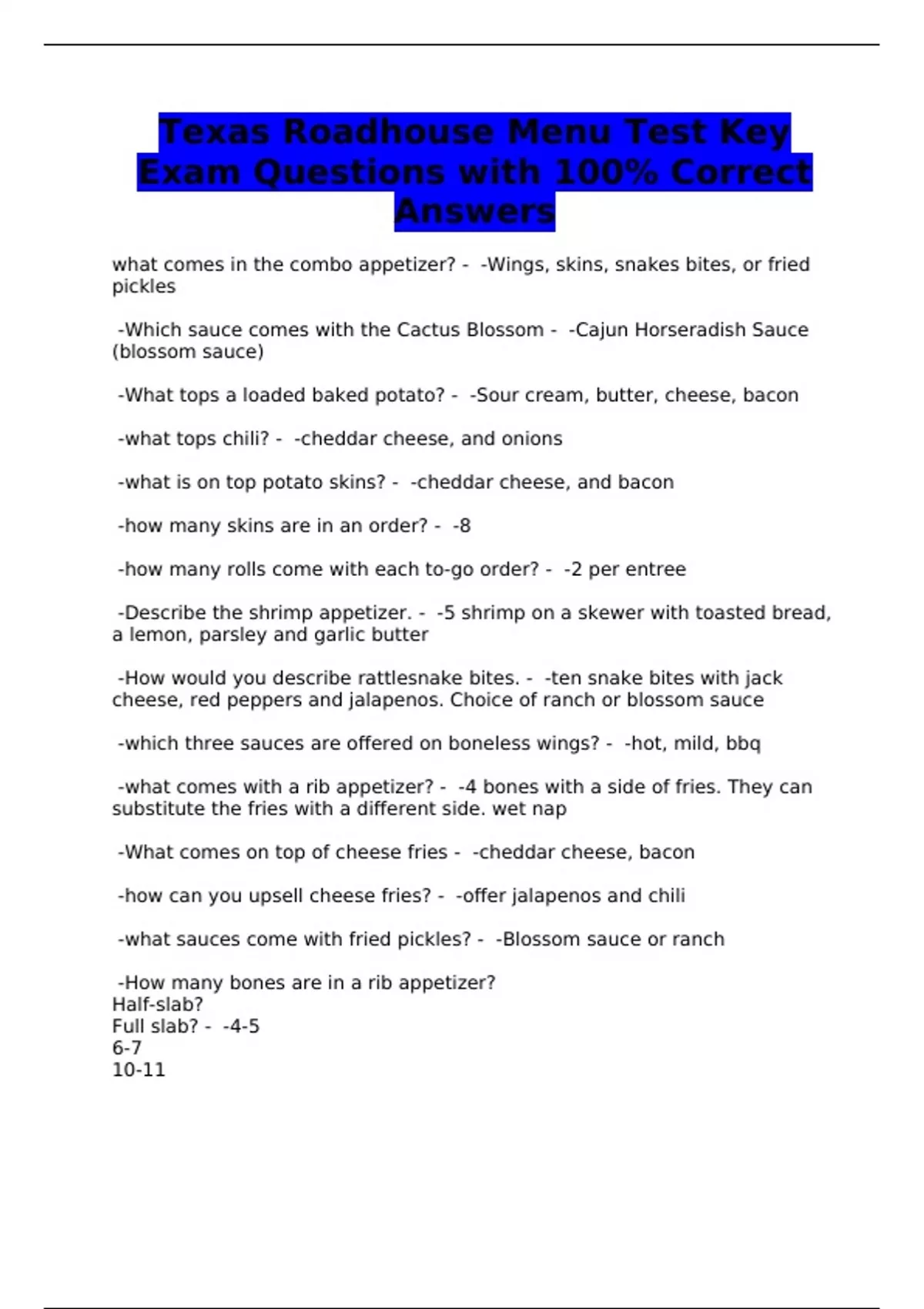 texas roadhouse menu test key exam questions with