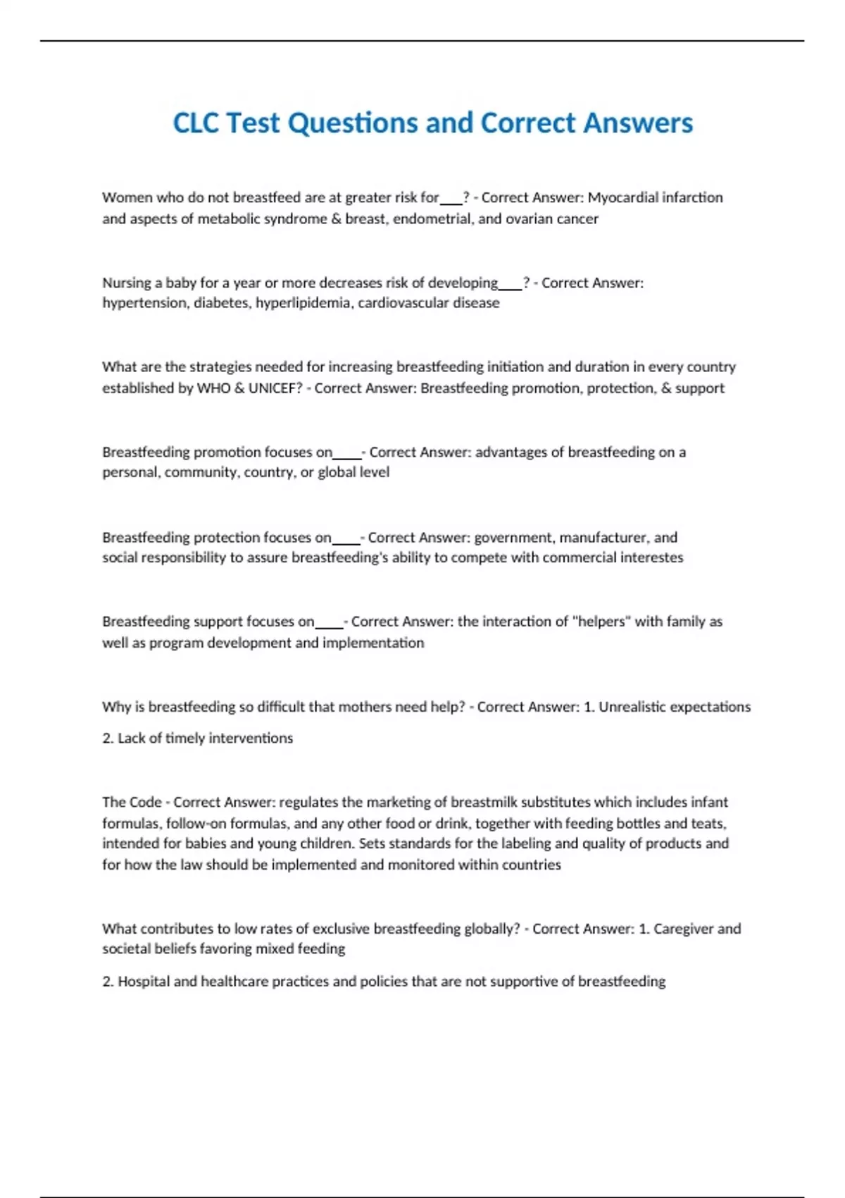 CLC Test Questions and Correct Answers Women who do not breastfeed are at greater risk for ? - Correct Answer: Myocardial infarction and aspects of metabolic syndrome & breast, endometrial, and ovarian cancer