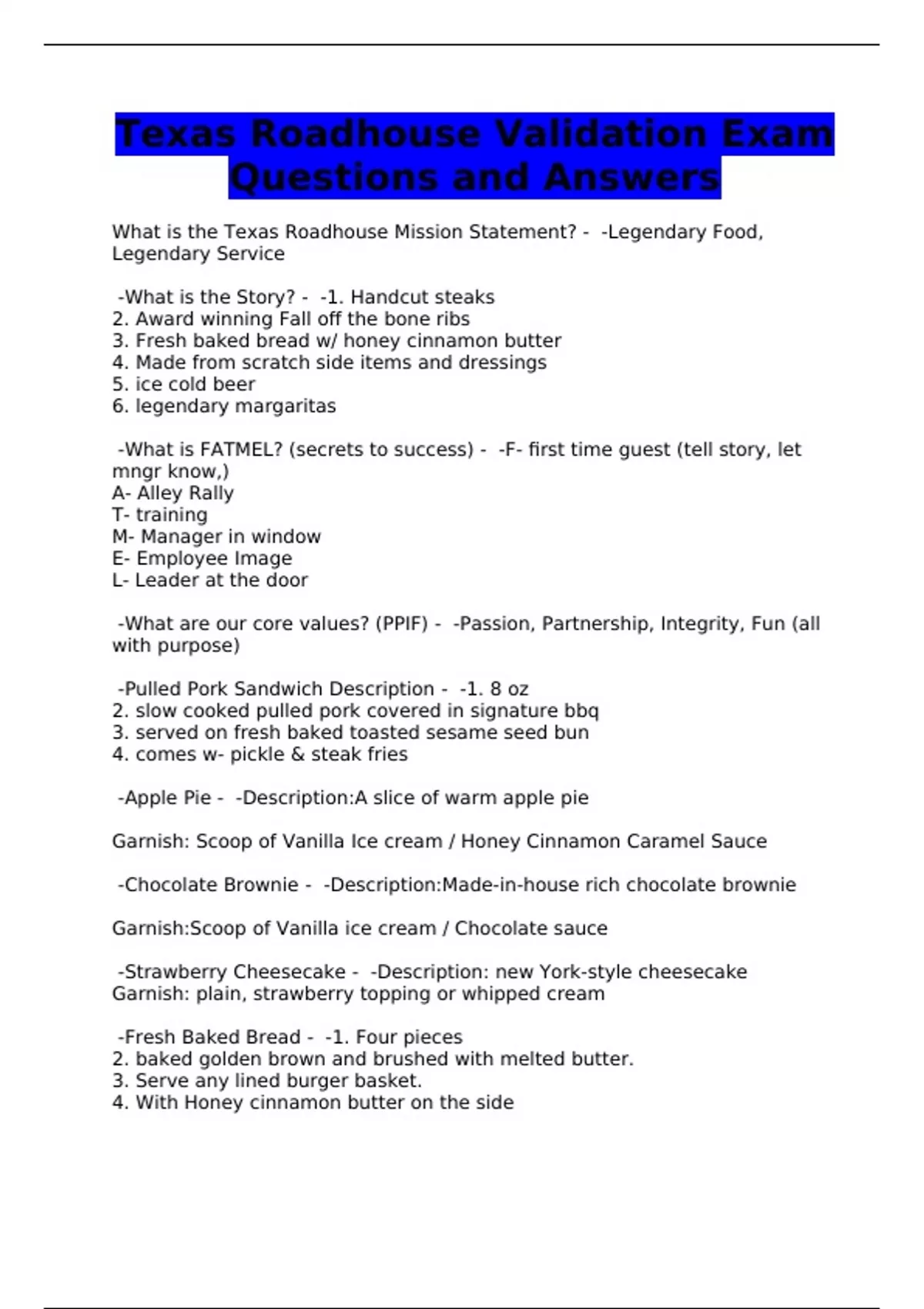 Texas Roadhouse Validation Exam Questions and Answers
