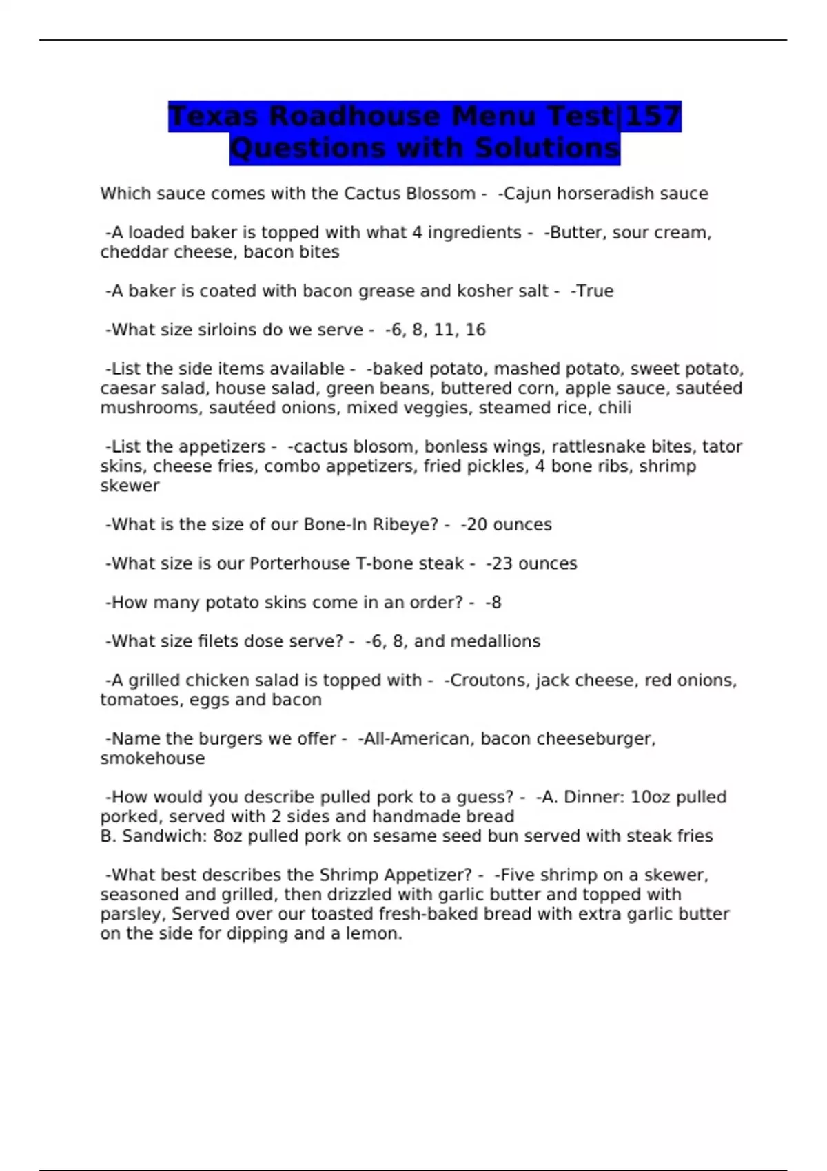 Texas Roadhouse Menu Test|157 Questions with Solutions