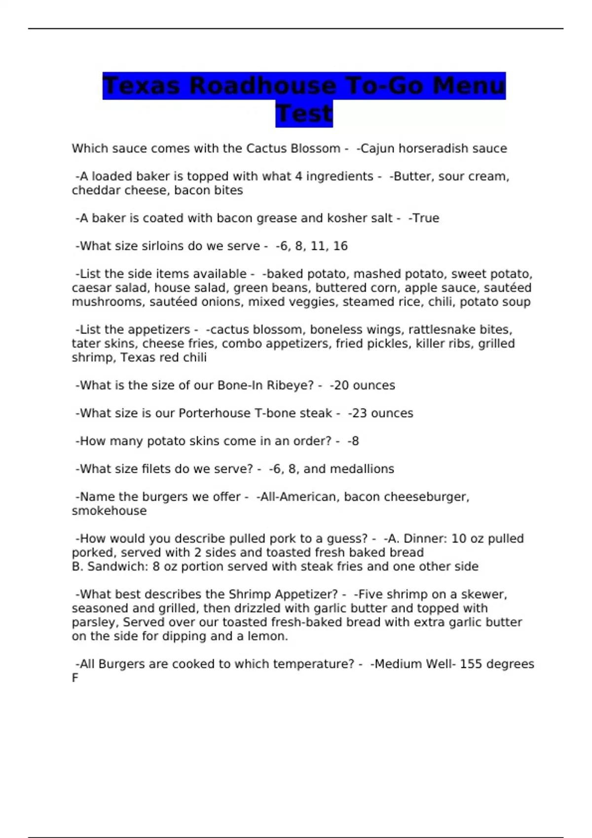 Texas Roadhouse Exams