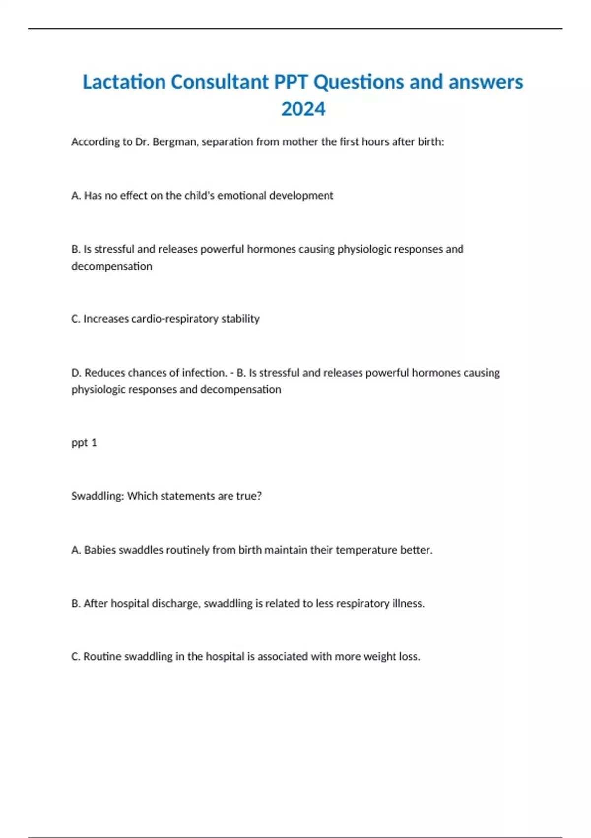 Lactation Consultant PPT Questions and answers 2024 According to Dr. Bergman, separation from mother the first hours after birth: A. Has no effect on the child's emotional development B. Is stressful and releases powerful hormones causing physiologic responses and decompensation C. Increases cardio-respiratory stability D. Reduces chances of infection.