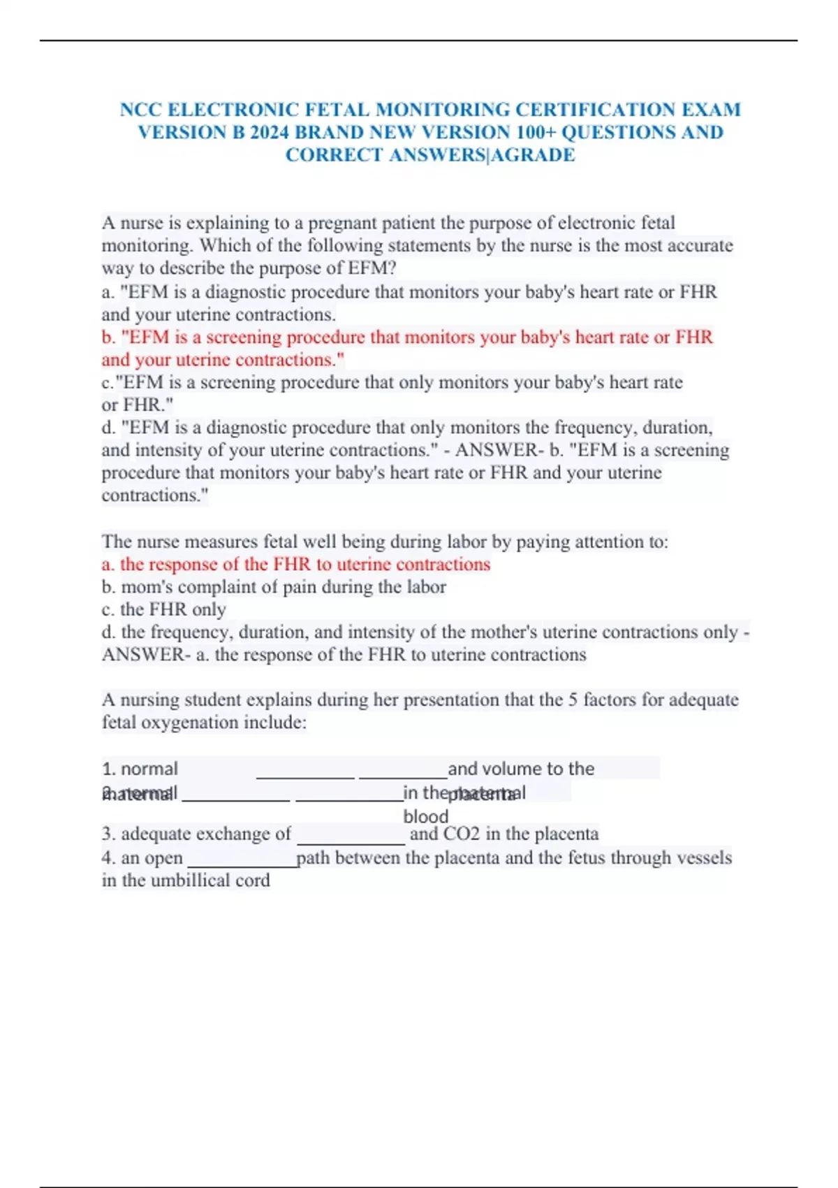 NCC ELECTRONIC FETAL MONITORING CERTIFICATION EXAM VERSION B 2024 BRAND NEW VERSION 100+ QUESTIONS AND CORRECT ANSWERS|AGRADE