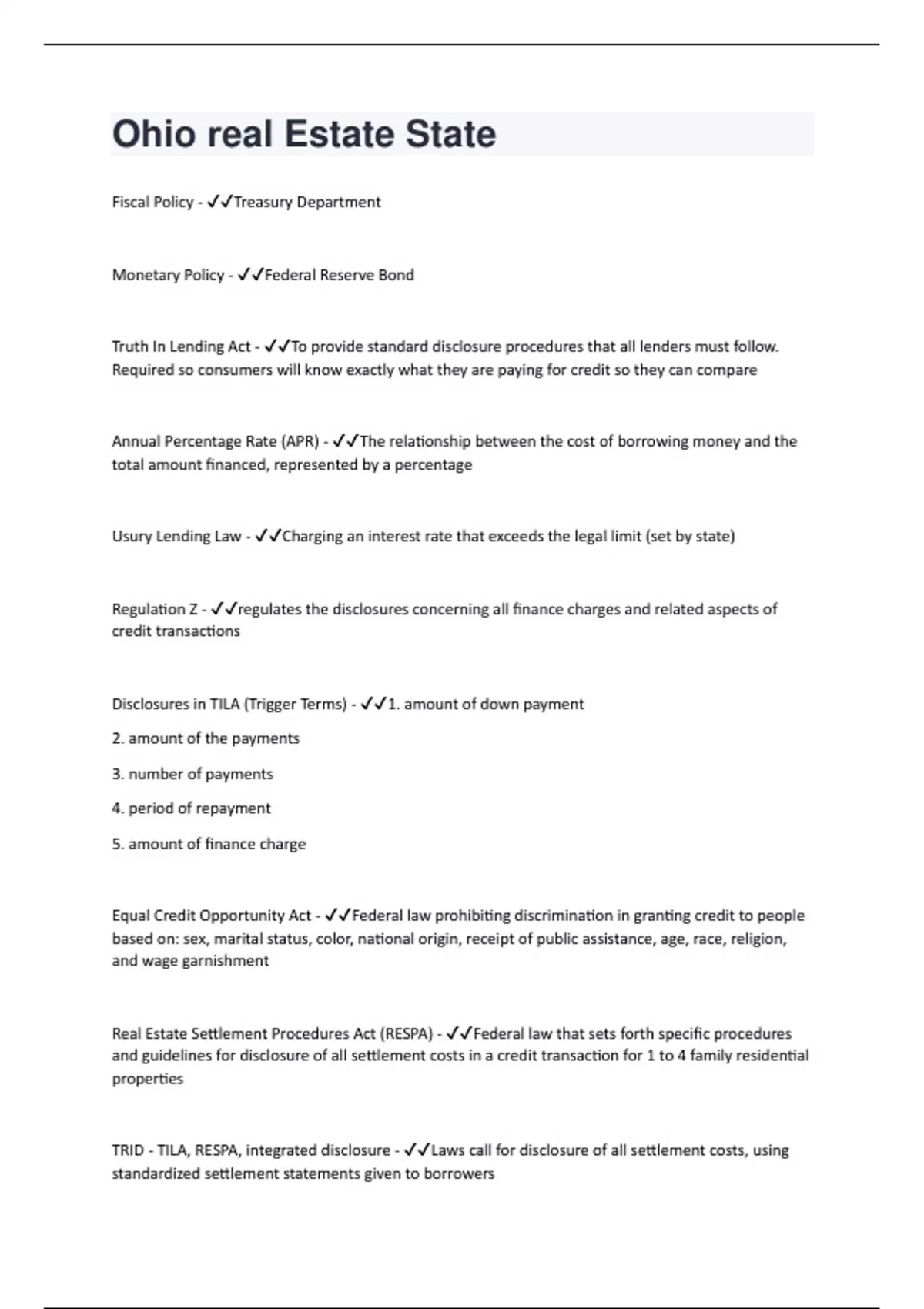Fiscal Policy - Treasury Department Monetary Policy - Federal Reserve Bond Truth In Lending Act - To provide standard disclosure procedures that all lenders must follow. Required so consumers will know exactly what they are paying for credit so they can compare Annual Percentage Rate (APR) - The relationship between the cost of borrowing money and the total amount financed, represented by a percentage Usury Lending Law - Charging an interest rate that exceeds the legal limit (set by state) Regulation Z - regulates the disclosures concerning all finance charges and related aspects of credit transactions Disclosures in TILA (Trigger Terms) - 1. amount of down payment 2. amount of the payments 3. number of payments 4. period of repayment 5. amount of finance charge Equal Credit Opportunity Act - Federal law prohibiting discrimination in granting credit to people based on: sex, marital status, color, national origin, receipt of public assistance, age, race, religion, and wage garnishment Real Estate Settlement Procedures Act (RESPA) - Federal law that sets forth specific procedures and guidelines for disclosure of all settlement costs in a credit transaction for 1 to 4 family residential properties TRID - TILA, RESPA, integrated disclosure - Laws call for disclosure of all settlement costs, using standardized settlement statements given to borrowersQualified Mortgage - loans made will be reviewed by the lender and the buyer must have the ability to repay the loan without risky features such as interest only period or a lump sum at the end of the loan term or any loan made for longer than 30 years Affiliated business arrangement disclosure (AfBA) - Required whenever a settlement service provider involved in a RESPA/TRID covered transaction refers the consumer to a provider with whom they have an ownership or other beneficial interest Promissory Note - The lender gives a loan to the borrower Lien on property - The borrower gives a mortgage to the lender Alienation Clause - When a buyer sells the property, the mortgage must be cancelled and the remaining balance of the loan must be paid back to the lender Acceleration Clause - When a buyer defaults on a loan, this gives the lender the right to declare the entire balance of the loan to be paid back immediately