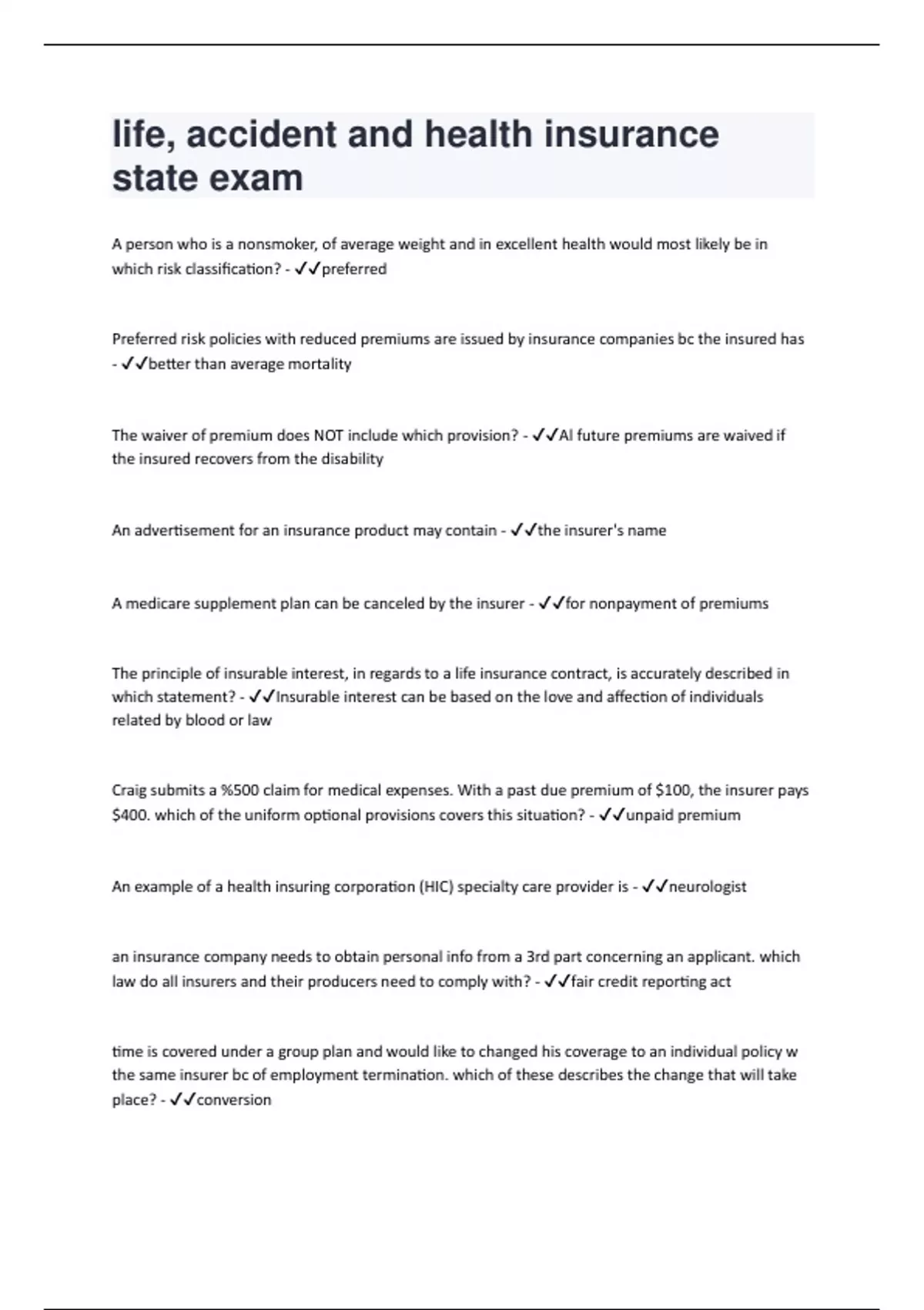 A person who is a nonsmoker, of average weight and in excellent health would most likely be in which risk classification? - preferred Preferred risk policies with reduced premiums are issued by insurance companies bc the insured has - better than average mortality The waiver of premium does NOT include which provision? - Al future premiums are waived if the insured recovers from the disability An advertisement for an insurance product may contain - the insurer's name A medicare supplement plan can be canceled by the insurer - for nonpayment of premiums The principle of insurable interest, in regards to a life insurance contract, is accurately described in which statement? - Insurable interest can be based on the love and affection of individuals related by blood or law Craig submits a %500 claim for medical expenses. With a past due premium of $100, the insurer pays $400. which of the uniform optional provisions covers this situation? - unpaid premium An example of a health insuring corporation (HIC) specialty care provider is - neurologist an insurance company needs to obtain personal info from a 3rd part concerning an applicant. which law do all insurers and their producers need to comply with? - fair credit reporting act time is covered under a group plan and would like to changed his coverage to an individual policy w the same insurer bc of employment termination. which of these describes the change that will take place? - conversionan agents appt has been terminated by insurer. the insurer must then notify the superintendent within how many days of the termination? - 30 the suicide clause of a life insurance policy states that if an insured commits suicide w in a stated period from the policy inception, the insurer will only be liable for a return of prisms paid - minus indebtedness and without interest which of the following is considered to be an alternative to a life settlement? - accelerated death benefit rider if the annuitant dies before the annuity start date, - the premiums paid plus interest earned will be given to the beneficiary a life insurance policy that has premiums fully paid up within a stated time period is called - limited payment insurance shopping for annuity that guarantees he cannot outlive the benefits. which of these benefit options would he choose - guaranteed lifetime withdrawal benefit