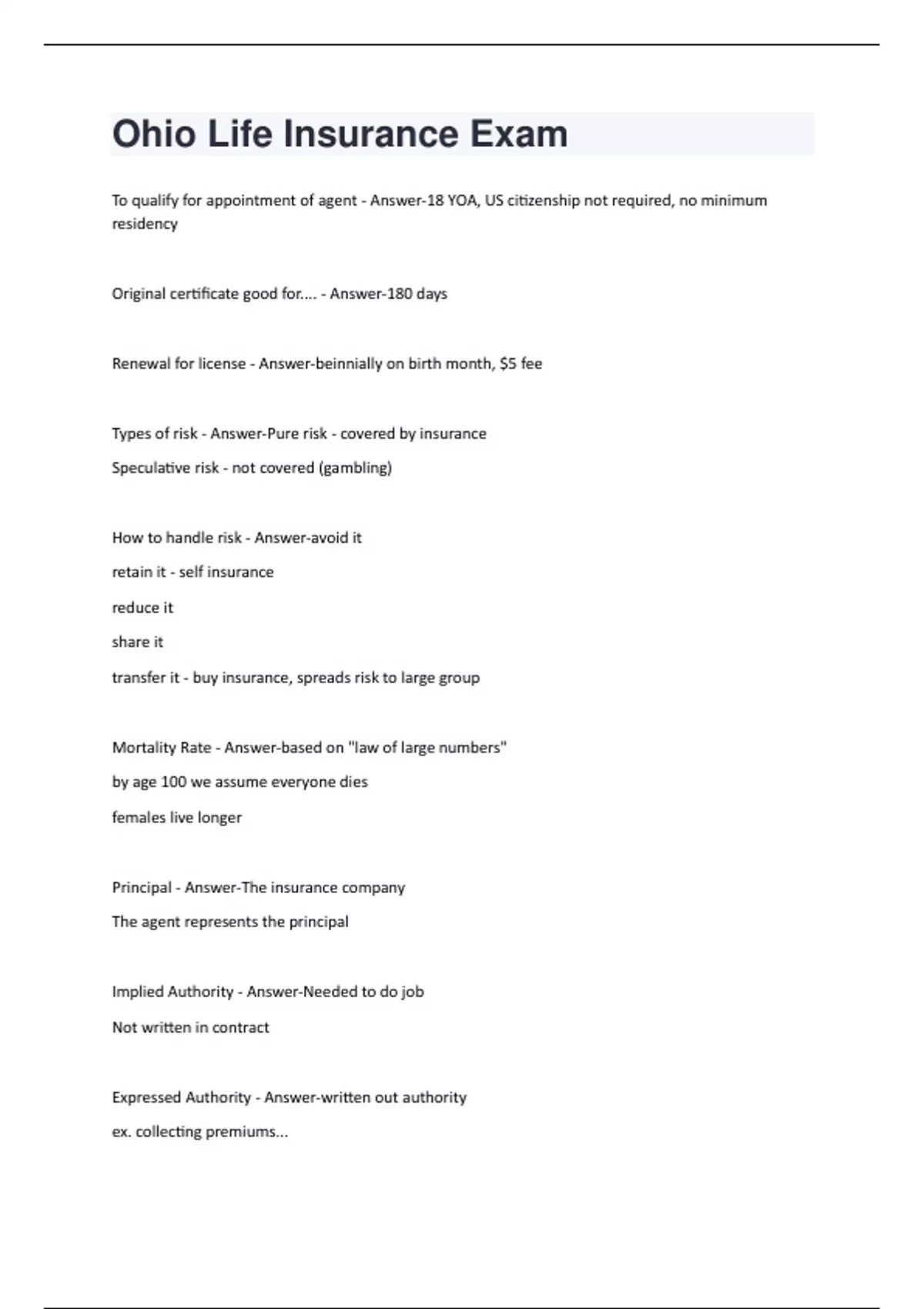To qualify for appointment of agent - Answer-18 YOA, US citizenship not required, no minimum residency Original certificate good for.... - Answer-180 days Renewal for license - Answer-beinnially on birth month, $5 fee Types of risk - Answer-Pure risk - covered by insurance Speculative risk - not covered (gambling) How to handle risk - Answer-avoid it retain it - self insurance reduce it share it transfer it - buy insurance, spreads risk to large group Mortality Rate - Answer-based on "law of large numbers" by age 100 we assume everyone dies females live longer Principal - Answer-The insurance company The agent represents the principal Implied Authority - Answer-Needed to do job Not written in contract Expressed Authority - Answer-written out authority ex. collecting premiums...Apparent Authority - Answer-actions seem to be those of principal ex. business cards, applications.... Change of name and address - Answer-30 days to be reported