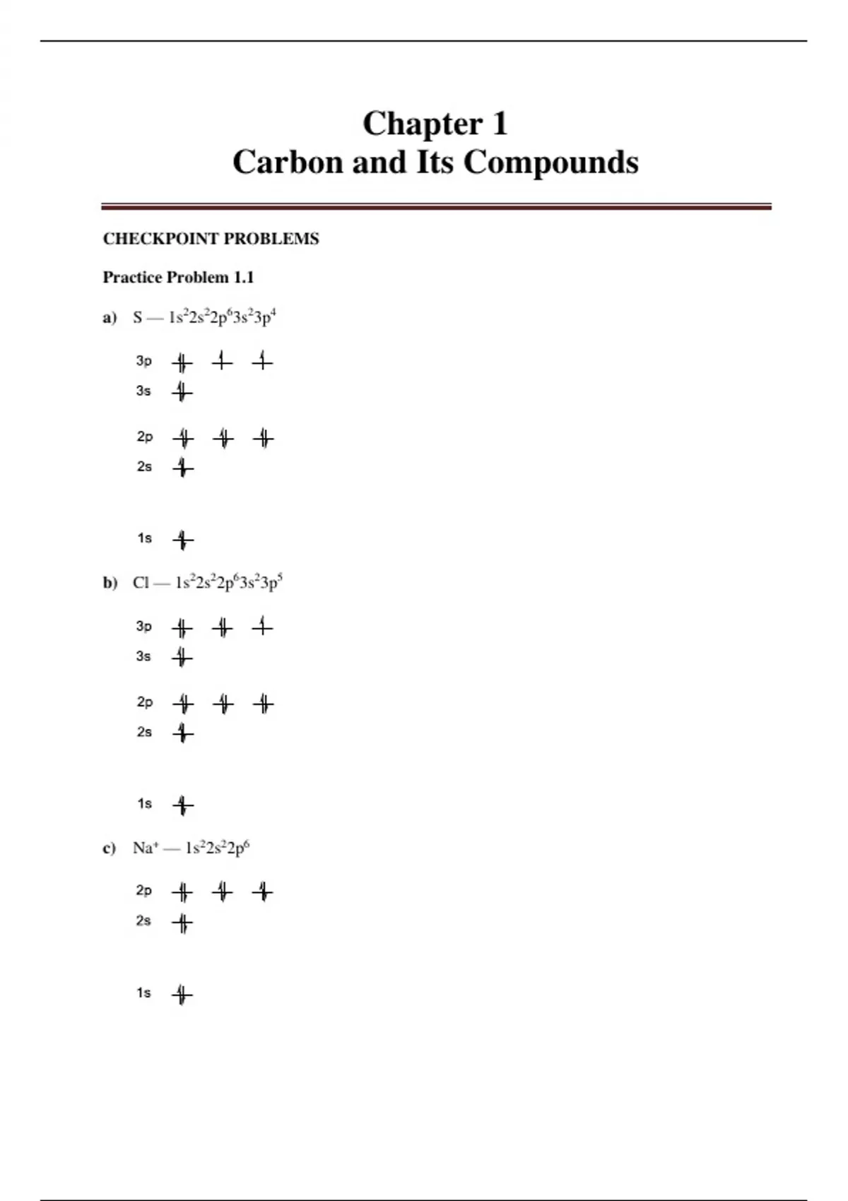 Chapter 1 Carbon and Its Compounds CHECKPOINT PROBLEMS Practice Problem 1.1 a) S — 1s2 2s2 2p6 3s2 3p4 b) Cl — 1s2 2s2 2p6 3s2 3p5 c) Na+ — 1s2 2s2 2p6 1-2 Copyright © 2018 Nelson Education Limited Practice Problem 1.2 a) Count valence electrons. Build a basic bonding framework and account for electrons used. Add remaining electrons and check for formal charges. The molecule has a lone pair on the nitrogen. All other electrons are bonding electrons. b) Count valence electrons. Build a basic bonding framework and account for electrons used. Copyright © 2018 Nelson Education Limited 1-3 Add remaining electrons and check for formal charges. There are formal charges on the S and O atoms. They can be removed by making an additional bond between O and S. The molecule has a lone pair on the sulfur and two lone pairs on oxygen. All other electrons are bonding electrons. c) Count valence electrons. Build a basic bonding framework and account for electrons used. 3 carbons (group 4) 5 hydrogens (group 1) 1 nitrogen (group 5) 3 X 4 = 12 5 X 1 = 5 1 X 5 = 5 22 valence e - CH3CH2CN (nitrogen is connected to one carbon only) 8 bonds = 16 bonding e22 valence e- – 16 bonding e- = 6 non-bonded e H C C C - H H H H N 1-4 Copyright © 2018 Nelson Education Limited Add remaining electrons and check for formal charges. The formal charges on C and N show the carbon needs more electrons and the N has too many. Forming two more bonds between C and N alleviates this problem. The molecule has a lone pair on the nitrogen. All other electrons are bonding electrons. d) Count valence electrons. Build a basic bonding framework and account for electrons used. Add remaining electrons and check for formal charges. The oxygen atom has three lone pairs and a positive charge. All other electrons are bonding electrons. Copyright © 2018 Nelson Education Limited 1-5 e) Count valence electrons. Build a basic bonding framework and account for electrons used. Add remaining electrons and check for formal charges. The ion has a formal positive charge on the nitrogen. All electrons are bonding electrons. f) Count valence electrons. Build a basic bonding framework and account for electrons used. 1-6 Copyright © 2018 Nelson Education Limited Add remaining electrons and check for formal charges. There are formal charges on the sulfur (+1) and two of the oxygens (-1). These can be reduced by forming a double bond between sulfur and either of the oxygen atoms carrying a formal charge. The ion has seven lone pairs on oxygen atoms and one lone pair on sulfur. All other electrons are bonding electrons. One oxygen has a formal negative charge. g) Count valence electrons. Build a basic bonding framework and account for electrons used. Add remaining electrons (on oxygen first) and check for formal charges. Copyright © 2018 Nelson Education Limited 1-7 There are formal charges on the sulfur (+3) and two of the oxygens (-1). These can be reduced by forming double bonds between sulfur and both charged oxygen atoms. This expands the octet of the sulfur but, since it is a third-row element, this is allowed. The final ion has six lone pairs on oxygen atoms. The sulfur has a formal positive charge. All other electrons are bonding electrons. Practice Problem 1.3 a) b) c) S O H O O H S O OR O O valence e- = 9 (9H) + 12 (3C) + 7 (1Cl) = 28 e - 28 valence e- – 18 bonding e- = 6 non-bonded eC C C O H H H H H H Lewis Structure C C C O H H H H H H reduce formal charges H3C C CH3 O dd+ dipole 1-8 Copyright © 2018 Nelson Education Limited d) Practice Problem 1.4 In the solutions, “BG” is used as an abbreviation for “bond group” and “LP” is used as an abbreviation for “lone pair.” a) b) c) H O C C C C C H H H H H H H H O H H–O bond dipole C–O bond dipole C=O bond dipole d+ dd+ dd+ Copyright © 2018 Nelson Education Limited 1-9 Integrate the Skill 1.5 All carbons have four bonds and so will not have lone pairs. Lone pairs are added to the nitrogen atoms according to the formal charges indicated. “BP” refers to shared pairs of electrons in bonds between atoms where each atom formally has one of the electrons. The geometry of the atoms can then be established for all of the atoms. Practice Problem 1.6 a) b) C C N C C N H H H H H H H formal charge of –1 = 6 valence e - = 2 (2BP) + 4 (2LP) formal charge of 0 = 5 valence e - = 3 (3BP) + 2 (1LP) C C C O C H H H H H H 3 BG trigonal planar 4 BG tetrahedral 2 BG + 2 LP bent C C C O C H H H H H H sp2 sp3 1-10 Copyright © 2018 Nelson Education Limited Integrate the Skill 1.7 a) Accounting for all of the electrons leaves four non-bonded electrons to add as lone pairs. These are added to the oxygen first (most electronegative), leaving the carbon with a formal positive charge. b) Electron geometry: c) Hybridization: d) The charged carbon is not saturated, so a second bond to the oxygen can be formed. This moves the formal charge to the oxygen atom. H C H H O C H H H C H H O C H H Copyright © 2018 Nelson Education Limited 1-11 This leads to the following geometries for the new structure. The corresponding hybridizations would then be Practice Problem 1.8 a) b) c) d) H C H H O C H H tetrahedral sp3 trigonal planar sp2 trigonal planar sp2 H3C NH2 O NH2 H3C NH2 O H3C O 1-12 Copyright © 2018 Nelson Education Limited Integrate the Skill 1.9 Drawing the basic structure leaves a formal positive charge on the carbon atom and lone pairs on each nitrogen atom. Three more resonance forms can be produced by forming a double bond between each of the nitrogen atoms and the central carbon atom. This leaves the formal charge on a nitrogen atom for each of these new forms. Practice Problem 1.10 a) i) ii) b) i) ii) c) i) ii) d) i) ii) H2N NH2 NH2 H2N NH2 NH2 H2N NH2 NH2 H2N NH2 NH2 Copyright © 2018 Nelson Education Limited 1-13 Integrate the Skill 1.11 The formal charge can be on the carbon or the oxygen. Both are acceptable Lewis structures. 1-14 Copyright © 2018 Nelson Education Limited PROBLEMS 