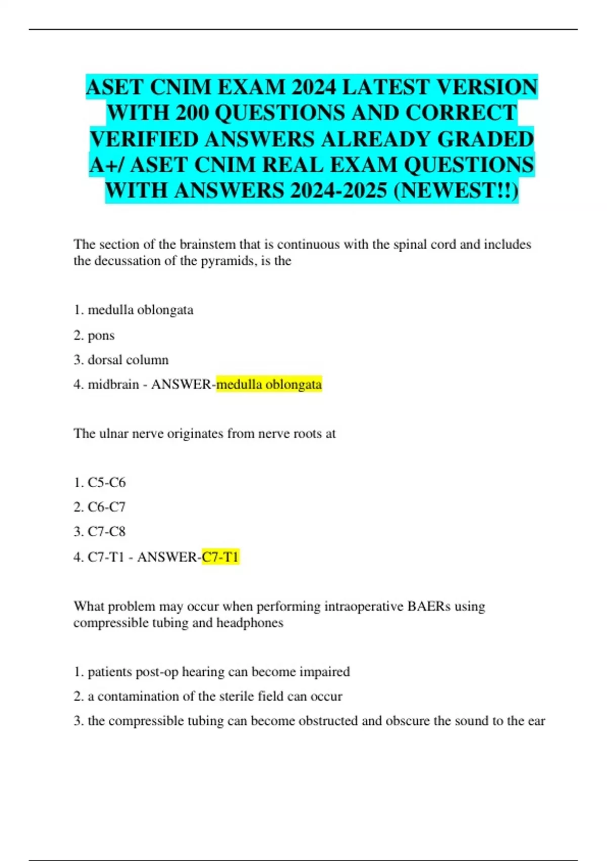 ASET CNIM EXAM 2024 LATEST VERSION WITH 200 QUESTIONS AND CORRECT VERIFIED ANSWERS ALREADY GRADED A+/ ASET CNIM REAL EXAM QUESTIONS WITH ANSWERS (NEWEST!!) The section of the brainstem that is continuous with the spinal cord and includes the decussation of the pyramids, is the 1. medulla oblongata 2. pons 3. dorsal column 4. midbrain - ANSWER-medulla oblongata The ulnar nerve originates from nerve roots at 1. C5-C6 2. C6-C7 3. C7-C8 4. C7-T1 - ANSWER-C7-T1 What problem may occur when performing intraoperative BAERs using compressible tubing and headphones 1. patients post-op hearing can become impaired 2. a contamination of the sterile field can occu