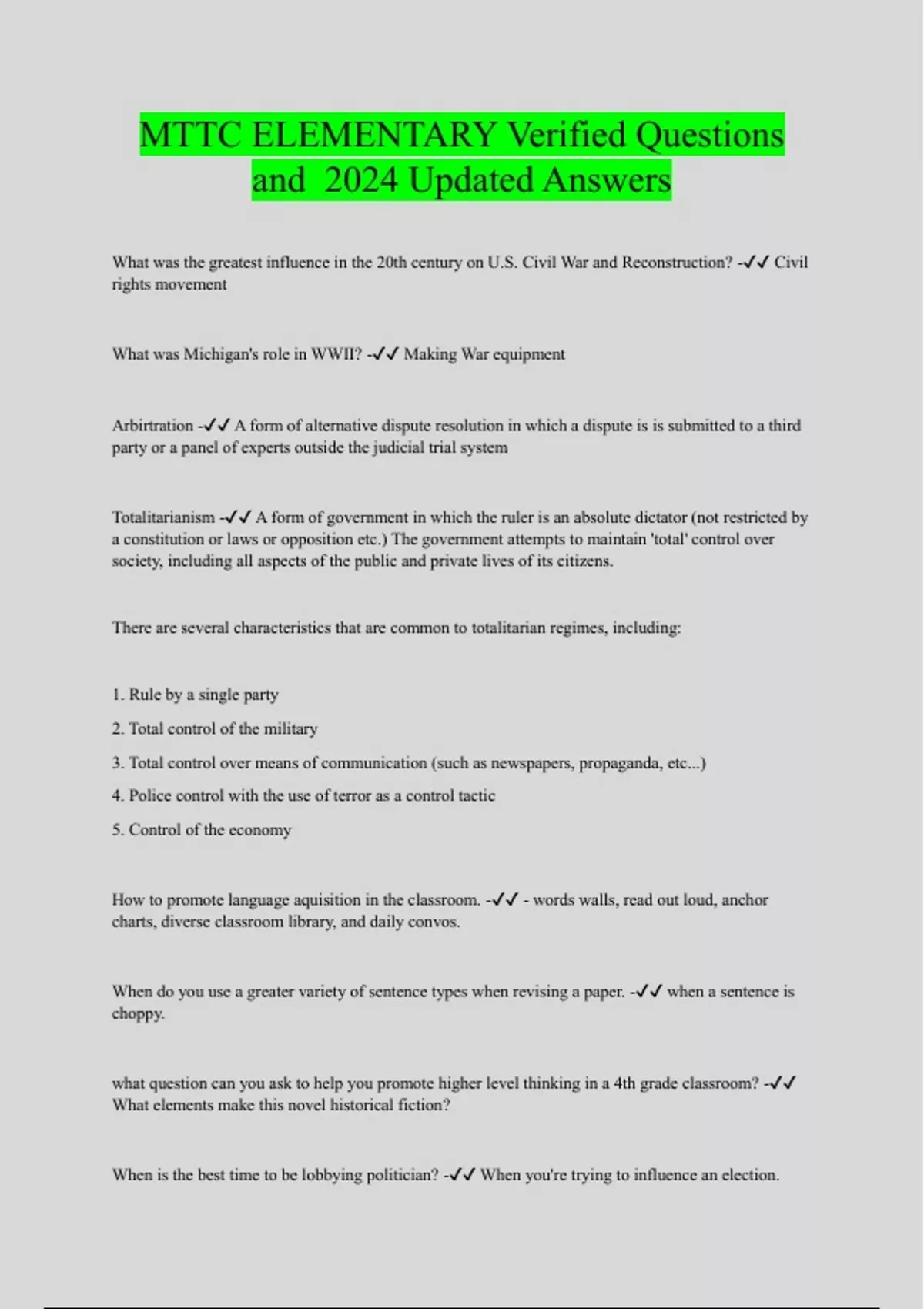 MTTC ELEMENTARY Verified Questions and 2024 Updated Answers
