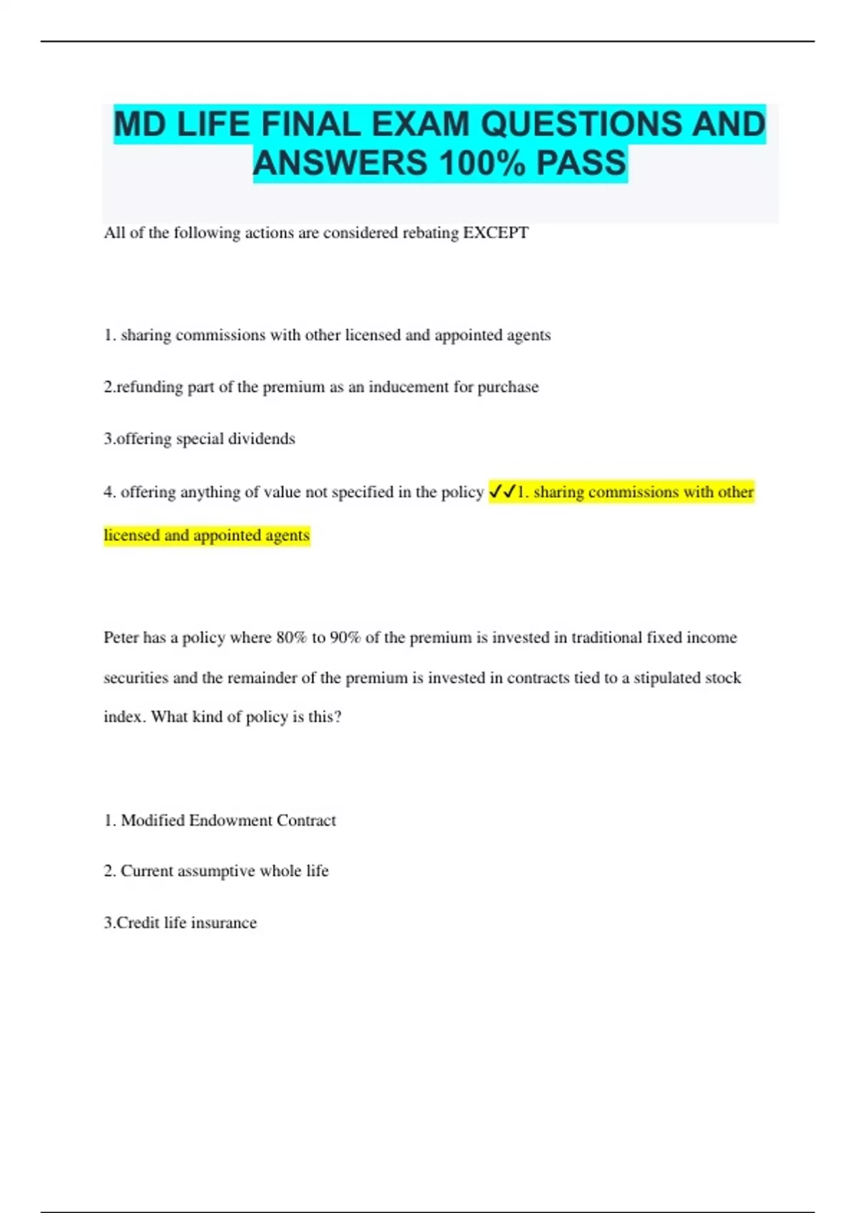 MD LIFE FINAL EXAM QUESTIONS AND ANSWERS 100% PASS All of the following actions are considered rebating EXCEPT 1. sharing commissions with other licensed and appointed agents ding part of the premium as an inducement for purchase ing special dividends 4. offering anything of value not specified in the policy 1. sharing commissions with other licensed and appointed agents Peter has a policy where 80% to 90% of the premium is invested in traditional fixed income securities and the remainder of the premium is invested in contracts tied to a stipulated stock index. What kind of policy is this? 1. Modified Endowment Contract 2. Current assumptive whole life 3.Credit life insurance 4. Equity index whole life 4."Equity index whole life". The type of policy where 80% to 90% of the premium is invested in traditional fixed income securities and the remainder of the premium is invested in contracts tied to a stipulated stock index is equity index whole life. A tax-free Section 1035 Exchange of a life insurance policy to a different policy is permitted if it occurs 1. in the same state as the original transaction 2. within a 12 month period 3. from insurer to insurer and no cash is received by the policyowner 4. from agent to agent as long as the agents are licensed in the same line 3. from insurer to insurer and no cash is received by the policyowner *The Internal Revenue Code (IRC) enables a tax-free Section 1035 Exchange of a life insurance policy to a different policy if it occurs from insurer to insurer and the policyowner does not receive any cash. According to life insurance contract law, insurable interest exists any business relationship exists 2. at the time of application 3. at the time of death 4. only when determined by a judge the time of application *According to life insurance in contract law, a person most likely will have an insurable interest in insuring a person's life if at the time of application An example of replacement is ling disability policy to buy a term life policy 2. canceling a term life policy to buy a whole life policy 3. canceling a long-term care policy to buy a whole life policy 4. canceling a whole life policy to buy a major medical policy ling a term life policy to buy a whole life policy When must a claim on a life insurance policy be paid after proof of loss has been received by the insurer? 1. Promptly 2.Within 10 days 3. Within 20 days 4. Within 30 days 1. Promptly Variable life insurance and Universal