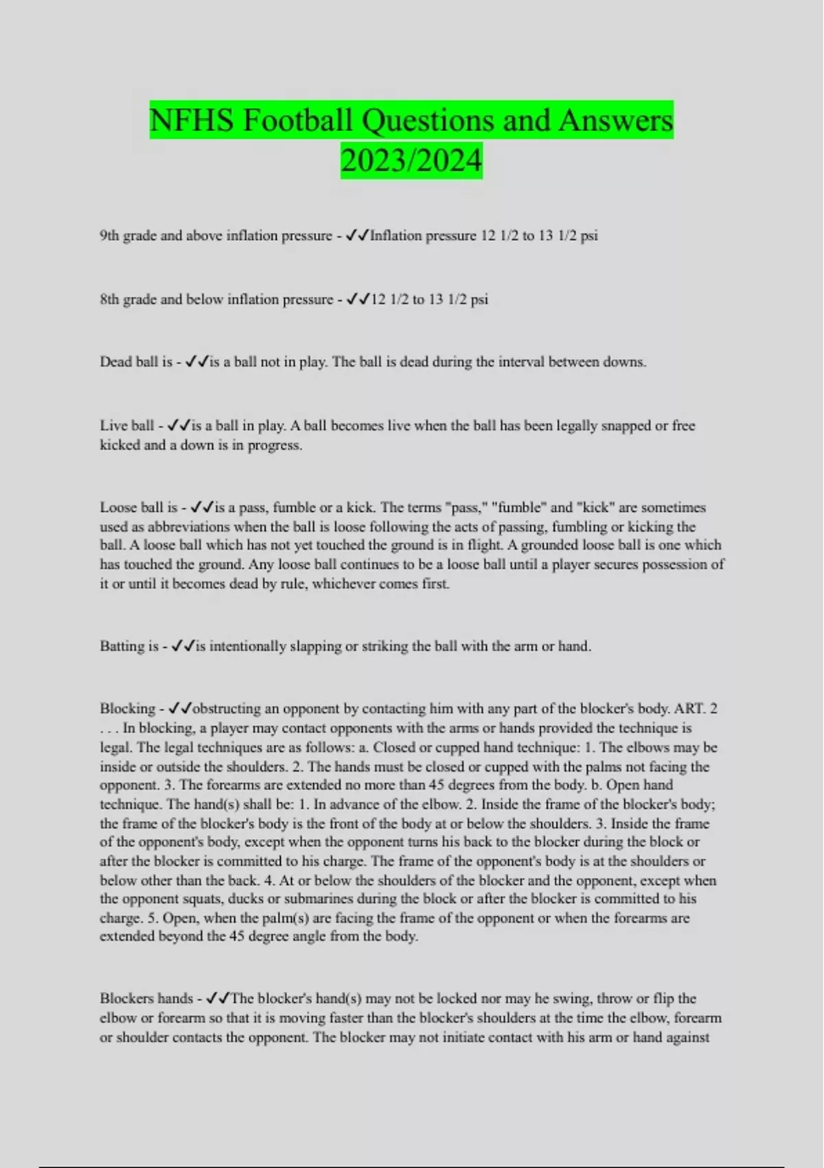 9th grade and above inflation pressure - Inflation pressure 12 1/2 to 13 1/2 psi 8th grade and below inflation pressure - 12 1/2 to 13 1/2 psi Dead ball is - is a ball not in play. The ball is dead during the interval between downs. Live ball - is a ball in play. A ball becomes live when the ball has been legally snapped or free kicked and a down is in progress. Loose ball is - is a pass, fumble or a kick. The terms "pass," "fumble" and "kick" are sometimes used as abbreviations when the ball is loose following the acts of passing, fumbling or kicking the ball. A loose ball which has not yet touched the ground is in flight. A grounded loose ball is one which has touched the ground. Any loose ball continues to be a loose ball until a player secures possession of it or until it becomes dead by rule, whichever comes first. Batting is - is intentionally slapping or striking the ball with the arm or hand. Blocking - obstructing an opponent by contacting him with any part of the blocker's body. ART. 2 . . . In blocking, a player may contact opponents with the arms or hands provided the technique is legal. The legal techniques are as follows: a. Closed or cupped hand technique: 1. The elbows may be inside or outside the shoulders. 2. The hands must be closed or cupped with the palms not facing the opponent. 3. The forearms are extended no more than 45 degrees from the body. b. Open hand technique. The hand(s) shall be: 1. In advance of the elbow. 2. Inside the frame of the blocker's body; the frame of the blocker's body is the front of the body at or below the shoulders. 3. Inside the frame of the opponent's body, except when the opponent turns his back to the blocker during the block or after the blocker is committed to his charge. The frame of the opponent's body is at the shoulders or below other than the back. 4. At or below the shoulders of the blocker and the opponent, except when the opponent squats, ducks or submarines during the block or after the blocker is committed to his charge. 5. Open, when the palm(s) are facing the frame of the opponent or when the forearms are extended beyond the 45 degree angle from the body.