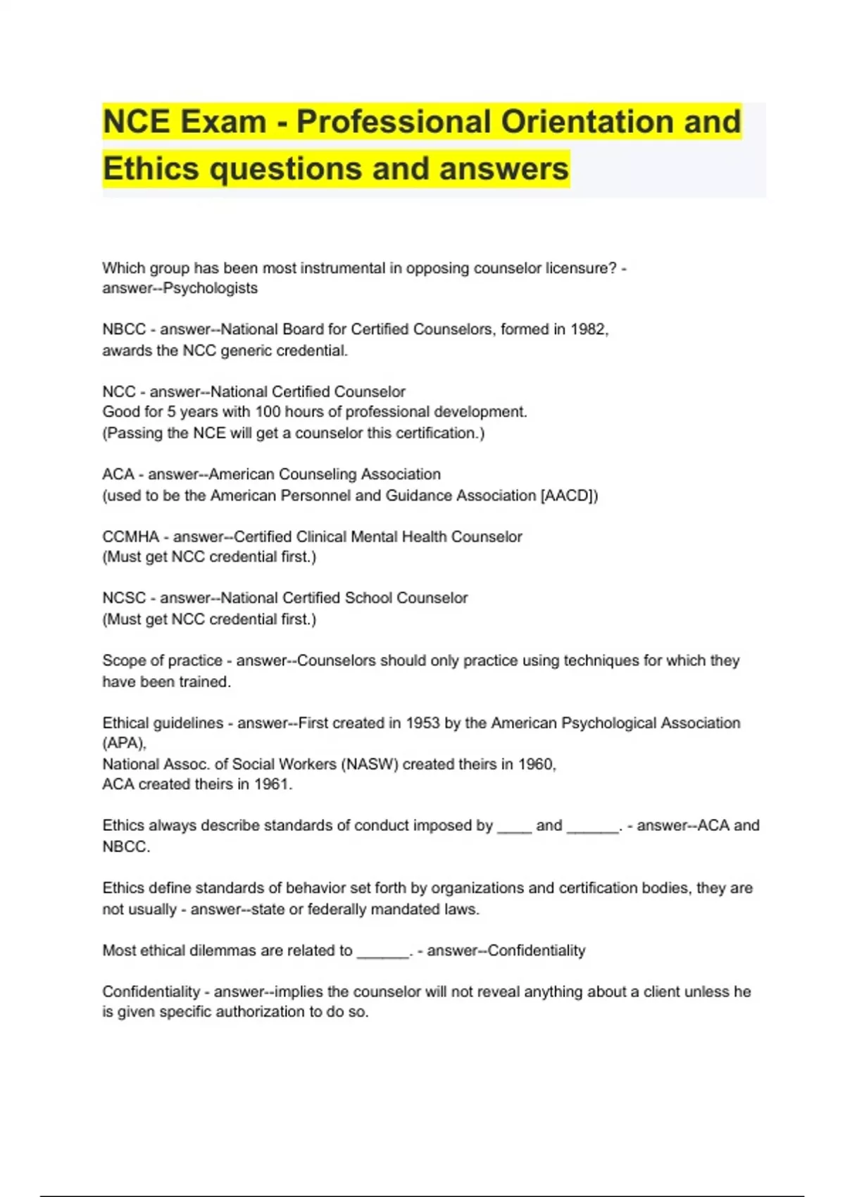 NCE Exam - Professional Orientation and Ethics questions and answers
