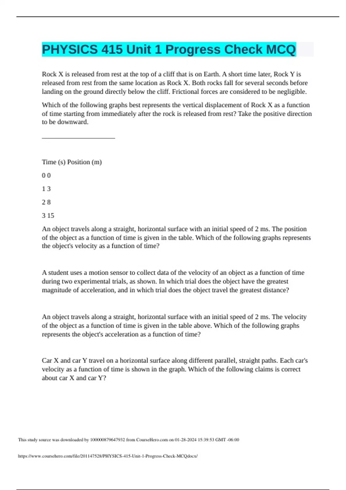 PHYSICS 415 Unit 1 Progress Check MCQ Rock X is released from rest at the top of a cliff that is on Earth. A short time later, Rock Y is released from rest from the same location as Rock X. Both rocks fall for several seconds before landing on the ground directly below the cliff. Frictional forces are considered to be negligible. Which of the following graphs best represents the vertical displacement of Rock X as a function of time starting from immediately after the rock is released from rest? Take the positive direction to be downward. _____________________ Time (s) Position (m) 0 0 1 3 2 8 3 15 An object travels along a straight, horizontal surface with an initial speed of 2 ms. The position of the object as a function of time is given in the table. Which of the following graphs represents the object's velocity as a function of time? A student uses a motion sensor to collect data of the velocity of an object as a function of time during two experimental trials, as shown. In which trial does the object have the greatest magnitude of acceleration, and in which trial does the object travel the greatest distance?