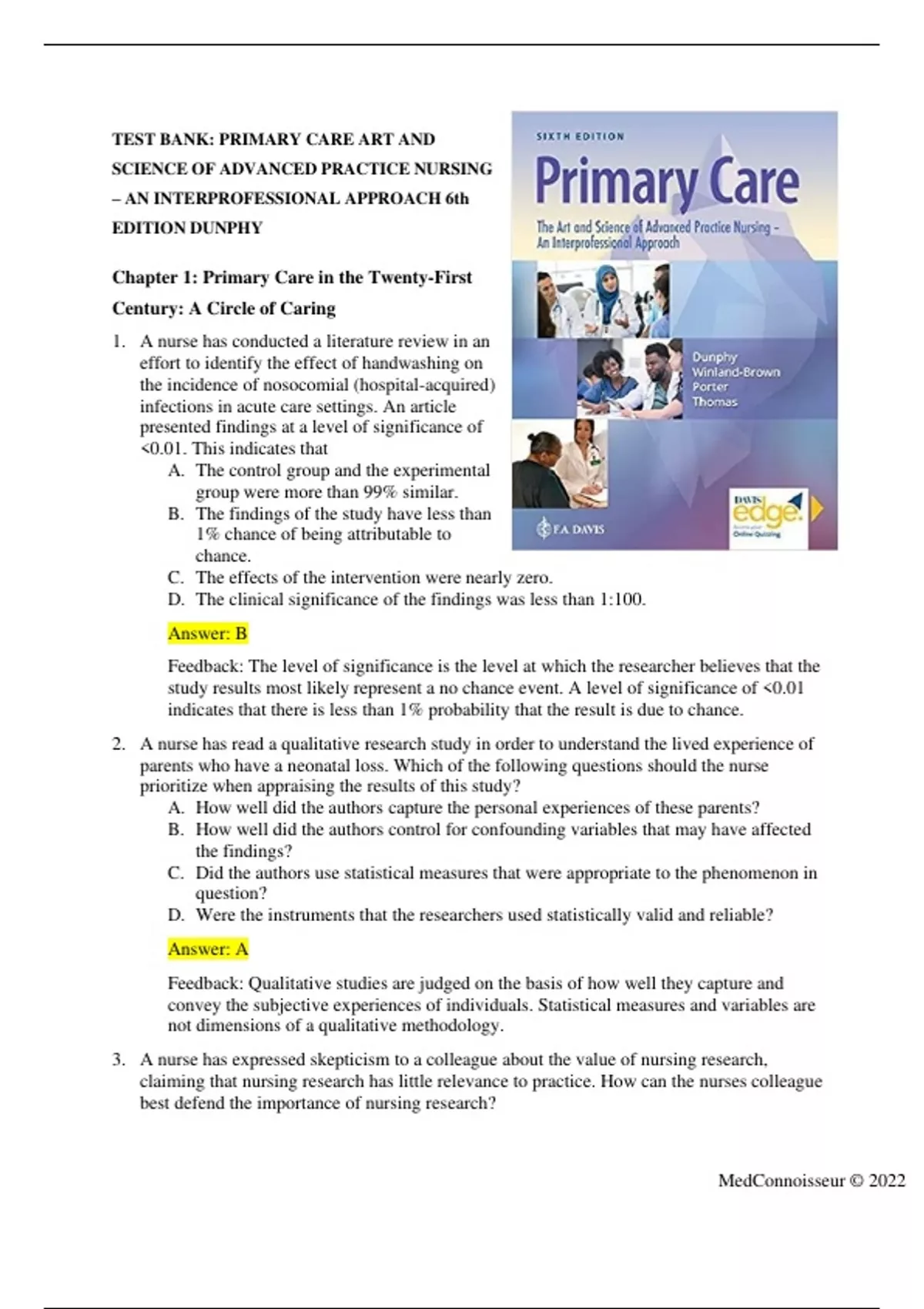 TEST BANK: PRIMARY CARE ART AND SCIENCE OF ADVANCED PRACTICE NURSING – AN INTERPROFESSIONAL APPROACH 6th EDITION DUNPHY Chapter 1: Primary Care in the Twenty-First Century: A Circle of Caring 1. A nurse has conducted a literature review in an effort to identify the effect of handwashing on the incidence of nosocomial (hospital-acquired) infections in acute care settings. An article presented findings at a level of significance of 0.01. This indicates that A. The control group and the experimental group were more than 99% similar. B. The findings of the study have less than 1% chance of being attributable to chance. C. The effects of the intervention were nearly zero. D. The clinical significance of the findings was less than 1:100. Answer: B Feedback: The level of significance is the level at which the researcher believes that the study results most likely represent a no chance event. A level of significance of 0.01 indicates that there is less than 1% probability that the result is due to chance. 2. A nurse has read a qualitative research study in order to understand the lived experience of parents who have a neonatal loss. Which of the following questions should the nurse prioritize when appraising the results of this study? A. How well did the authors capture the personal experiences of these parents? B. How well did the authors control for confounding variables that may have affected the findings? C. Did the authors use statistical measures that were appropriate to the phenomenon in question? D. Were the instruments that the researchers used statistically valid and reliable? Answer: A Feedback: Qualitative studies are judged on the basis of how well they capture and convey the subjective experiences of individuals. Statistical measures and variables are not dimensions of a qualitative methodology. 3. A nurse has expressed skepticism to a colleague about the value of nursing research, claiming that nursing research has little relevance to practice. How can the nurses colleague best defend the importance of nursing research? MedConnoisseur © 2022 A) The existence of nursing research means that nurses are now able to access federal grant money, something that didnt use to be the case. B) Nursing research has allowed the development of masters and doctoral programs and has greatly increased the credibility of the profession. C) The growth of nursing research has caused nursing to be viewed as a true profession, rather than simply as a trade or a skill. D) The application of nursing research has the potential to improve nursing practice and patient outcomes. Answer: D Feedback: The greatest value of nursing research lies in the potential to improve practice and, ultimately, to improve patient outcomes. This supersedes the contributions of nursing research to education programs, grant funding, or the public view of the profession. 4. Tracy is a nurse with a baccalaureate degree who works in the labor and delivery unit of a busy urban hospital. She has noticed that many new mothers abandon breast-feeding their babies when they experience early challenges and wonders what could be done to encourage more women to continue breast-feeding. What role is Tracy most likely to play in a research project that tests an intervention aimed at promoting breast-feeding? A) Applying for grant funding for the research project B) Posing the clinical problem to one or more nursing researchers C) Planning the methodology of the research project D) Carrying out the intervention and submitting the results for publication Answer: B Feedback: A major role for staff nurses is to identify questions or problems for research. Grant applications, methodological planning, and publication submission are normally carried out by nurses who have advanced degrees in nursing. 5. A patient signed the informed consent form for a drug trial that was explained to patient by a research assistant. Later, the patient admitted to his nurse that he did not understand the research assistants explanation or his own role in the study. How should this patients nurse respond to this revelation? A) Explain the research process to the patient in greater detail. B) Describe the details of a randomized controlled trial for the patient. C) Inform the research assistant that the patients consent is likely invalid. D) Explain to the patient that his written consent is now legally binding. Answer: C MedConnoisseur © 2022 Feedback: Just as the staff nurse is not responsible for medical consent, the staff nurse is not responsible for research consent. If patients who have agreed to participate exhibit ambivalence or uncertainty about participating, do not try to convince them to participate. Ask the person from the research team who is managing consents to speak with concerned patients about the study, even after a patient has signed the consent forms. 6. A nurse leader is attempting to increase the awareness of evidence-based practice (EBP) among the nurses on a unit. A nurse who is implementing EBP integrates which of the following? (Select all that apply.) A) Interdisciplinary consensus B) Nursing tradition C) Research studies D) Patient preferences and values E) Clinical expertise Answer: C, D, E Feedback: Fineout-Overholt, Melnyk, Stillwell, and Williamson define EBP as a problemsolving approach to the delivery of healthcare that integrates the best evidence from studies and patient care data with clinician expertise and patient preferences and values. 7. Mrs. Mayes is a 73-year-old woman who has a diabetic foot ulcer that has been extremely slow to heal and which now poses a threat of osteomyelitis. The wound care nurse who has been working with Mrs. Mayes applies evidence-based practice (EBP) whenever possible and has proposed the use of maggot therapy to debride necrotic tissue. Mrs. Mayes, however, finds the suggestion repugnant and adamantly opposes this treatment despite the sizable body of evidence supporting it. How should the nurs