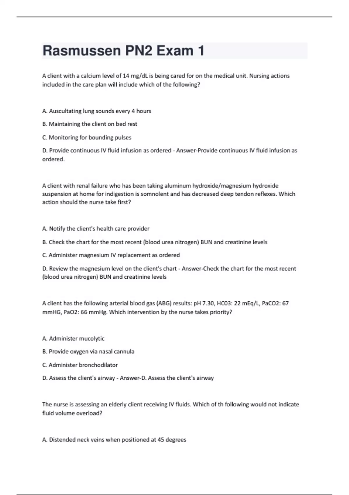 A client with a calcium level of 14 mg/dL is being cared for on the medical unit. Nursing actions included in the care plan will include which of the following? A. Auscultating lung sounds every 4 hours B. Maintaining the client on bed rest C. Monitoring for bounding pulses D. Provide continuous IV fluid infusion as ordered - Answer-Provide continuous IV fluid infusion as ordered. A client with renal failure who has been taking aluminum hydroxide/magnesium hydroxide suspension at home for indigestion is somnolent and has decreased deep tendon reflexes. Which action should the nurse take first? A. Notify the client's health care provider B. Check the chart for the most recent (blood urea nitrogen) BUN and creatinine levels C. Administer magnesium IV replacement as ordered D. Review the magnesium level on the client's chart - Answer-Check the chart for the most recent (blood urea nitrogen) BUN and creatinine levels A client has the following arterial blood gas (ABG) results: pH 7.30, HC03: 22 mEq/L, PaCO2: 67 mmHG, PaO2: 66 mmHg. Which intervention by the nurse takes priority? A. Administer mucolytic B. Provide oxygen via nasal cannula C. Administer bronchodilator D. Assess the client's airway - Answer-D. Assess the client's airway The nurse is assessing an elderly client receiving IV fluids. Which of th following would not indicate fluid volume overload? A. Distended neck veins when positioned at 45 degreesB. Pitting edema of the lower extremities C. Dry mucous membranes D. Course crackles in the lung field - Answer-Dry mucous membranes A nurse is preparing to infuse a 400mL unit of packed red blood cells (PRBCs) over 4 hours. The drop factor of the manual IV tubing is 50 gtts/mL. What is the infusion rate in gtts/min? (Round the answer to the nearest whole number) - Answer-83 A nurse is preparing to administer intravenous ibuprofen in 400mg IV to her client diagnosed with a urinary tract infection. The medication is available as 400mg/100mL normal saline solution. The order is to infuse the 50mL bag in 30 min. What is the rate in mL/hr the nurse must infuse the medication? (Round to the nearest whole number) - Answer-200 Immediately after having surgery to create an ileostomy, which goal has the highest priority? A. Maintain fluid and electrolyte balance B. Providing relief from constipation C. Minimizing odor formation D. Assisting the client with self-care activities - Answer-Maintain fluid and electrolyte balance