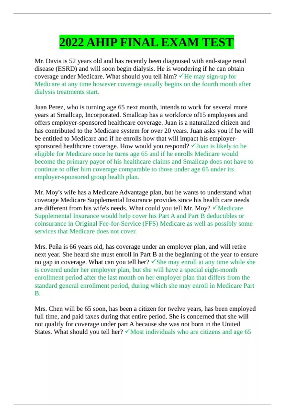 2022 AHIP FINAL EXAM TEST Mr. Davis is 52 years old and has recently been diagnosed with end-stage renal disease (ESRD) and will soon begin dialysis. He is wondering if he can obtain coverage under Medicare. What should you tell him? He may sign-up for Medicare at any time however coverage usually begins on the fourth month after dialysis treatments start. Juan Perez, who is turning age 65 next month, intends to work for several more years at Smallcap, Incorporated. Smallcap has a workforce of15 employees and offers employer-sponsored healthcare coverage. Juan is a naturalized citizen and has contributed to the Medicare system for over 20 years. Juan asks you if he will be entitled to Medicare and if he enrolls how that will impact his employersponsored healthcare coverage. How would you respond? Juan is likely to be eligible for Medicare once he turns age 65 and if he enrolls Medicare would become the primary payor of his healthcare claims and Smallcap does not have to continue to offer him coverage comparable to those under age 65 under its employer-sponsored group health plan. Mr. Moy's wife has a Medicare Advantage plan, but he wants to understand what coverage Medicare Supplemental Insurance provides since his health care needs are different from his wife's needs. What could you tell Mr. Moy? Medicare Supplemental Insurance would help cover his Part A and Part B deductibles or coinsurance in Original Fee-for-Service (FFS) Medicare as well as possibly some services that Medicare does not cover. Mrs. Peňa is 66 years old, has coverage under an employer plan, and will retire next year. She heard she must enroll in Part B at the beginning of the year to ensure no gap in coverage. What can you tell her? She may enroll at any time while she is covered under her employer plan, but she will have a special eight-month enrollment period after the last month on her employer plan that differs from the standard general enrollment period, during which she may enroll in Medicare Part B. Mrs. Chen will be 65 soon, has been a citizen for twelve years, has been employed full time, and paid taxes during that entire period. She is concerned that she will not qualify for coverage under part A because she was not born in the United States. What should you tell her? Most individuals who are citizens and age 65 or over are covered under Part A by virtue of having paid Medicare taxes while working, though some may be covered as a result of paying monthly premiums. Mrs. Gonzalez is enrolled in Original Medicare and has a Medigap policy as well, but it provides no drug coverage. She would like to keep the coverage she has but replace her existing Medigap plan with one that provides drug coverage. What should you tell her? Mrs. Gonzalez cannot purchase a Medigap plan that covers drugs, but she could keep her Medigap policy and enroll in a Part D prescription drug plan. Mrs. West wears glasses and dentures and has enjoyed considerable pain relief from arthritis through massage therapy. She is concerned about whether or not Medicare will cover these items and services. What should you tell her? Medicare does not cover massage therapy, or, in general, glasses or dentures. Mr. Patel is in good health and is preparing a budget in anticipation of his retirement when he turns 66. He wants to understand the health care costs he might be exposed to under Medicare if he were to require hospitalization as a result of an illness. In general terms, what could you tell him about his costs for inpatient hospital services under Original Medicare? Under Original Medicare, there is a single deductible amount due for the first 60 days of any inpatient hospital stay, after which it converts into a per-day coinsurance amount through day 90. After day 90, he would pay a daily amount up to 60 days over his lifetime, after which he would be responsible for all costs. Ms. Henderson believes that she will qualify for Medicare Coverage when she turns 65, without paying any premiums, because she has been working for 40 years and paying Medicare taxes. What should you tell her? To obtain Part B coverage, she must pay a standard monthly premium, though it is higher for individuals with higher incomes. Mr. Alonso receives some help paying for his two generic prescription drugs from his employer's retiree coverage, but he wants to compare it to a Part D prescription drug plan. He asks you what costs he would generally expect to encounter when enrolling into a standard MedicarePart D prescription drug plan. What should you tell him? He generally would pay a monthly premium, annual deductible, and per-prescription cost-sharing. Ms. Moore plans to retire when she turns 65 in a few months. She is in excellent health and will have considerable income when she retires. She is concerned that her income will make it impossible for her to qualify for Medicare. What could you tell her to address her concern? Medicare is a program for people age 65 or older and those under age 65 with certain disabilities, end-stage renal disease, and Lou Gehrig's disease so she will be eligible for Medicare. Mr. Xi will soon turn age 65 and has come to you for advice as to what services are provided under Original Medicare. What should you tell Mr. Xi that best describes the health coverage provided to Medicare beneficiaries? Beneficiaries under Original Medicare have no cost-sharing for most preventive services which include immunizations such as annual flu shots. Mrs. Duarte is enrolled in Original Medicare Parts A and B. She has recently reviewed her Medicare Summary Notice (MSN) and disagrees with a determination that partially denied one of her claims for services. What advice would you give her? Mrs. Duarte should file an appeal of this initial determination within 120 days of the date she received the MSN in the mail. Mr. Capadona would like to purchase a Medicare Advantage (MA) plan and a Medigap plan to pick up costs not covered by that plan. What should you