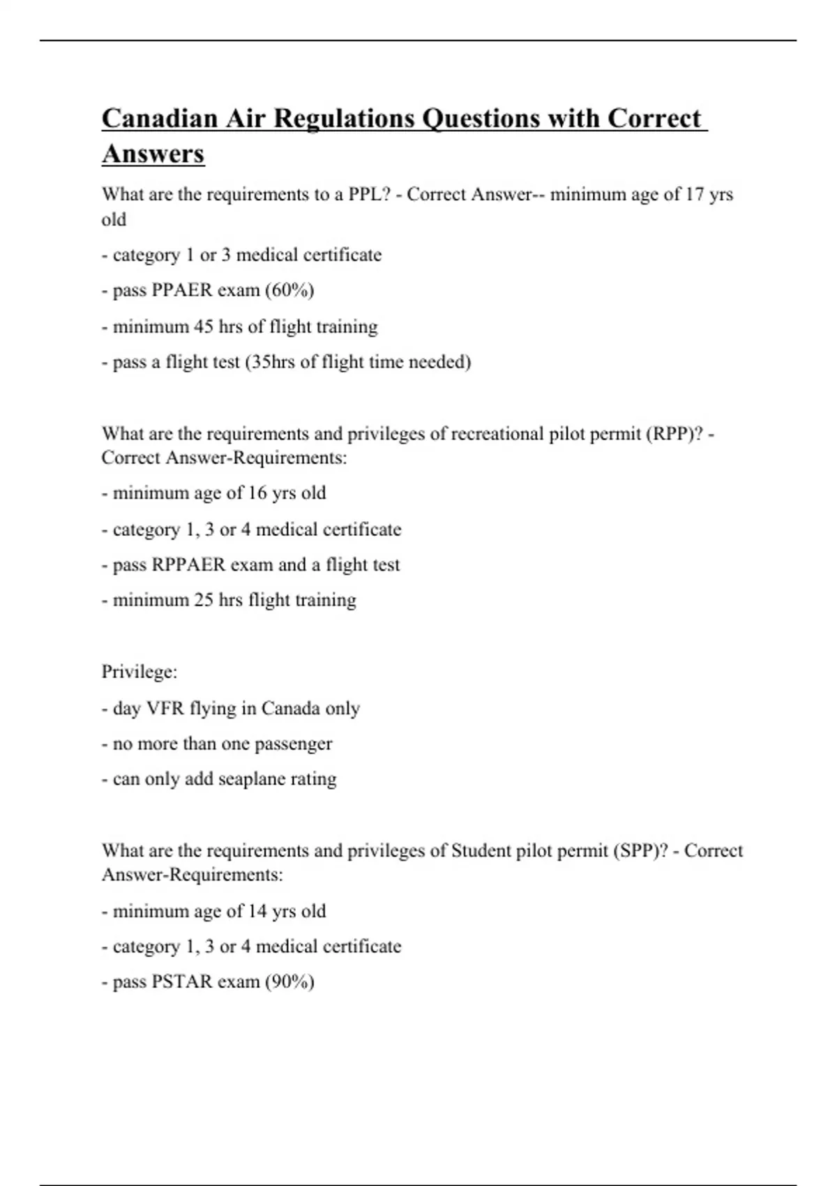 Canadian Air Regulations Questions with Correct Answers