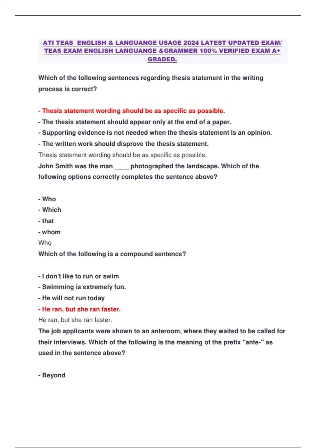 ATI TEAS ENGLISH & LANGUANGE USAGE 2024 LATEST UPDATED EXAM/ TEAS EXAM ENGLISH LANGUANGE &GRAMMER 100% VERIFIED EXAM A+ GRADED. Which of the following sentences regarding thesis statement in the writing process is correct? - Thesis statement wording should be as specific as possible. - The thesis statement should appear only at the end of a paper. - Supporting evidence is not needed when the thesis statement is an opinion. - The written work should disprove the thesis statement. Thesis statement wording should be as specific as possible. John Smith was the man ____ photographed the landscape. Which of the following options correctly completes the sentence above? - Who - Which - that - whom Who Which of the following is a compound sentence? - I don't like to run or swim - Swimming is extremely fun. - He will not run today - He ran, but she ran faster. He ran, but she ran faster. The job applicants were shown to an anteroom, where they waited to be called for their interviews. Which of the following is the meaning of the prefix "ante-" as used in the sentence above? - Beyond - After - Against - Before Before Based upon the affixes, which of the following words could be defined as "the study of humans"? - Anthropomorphism - anthropology - Philanthropy - Biology anthropology