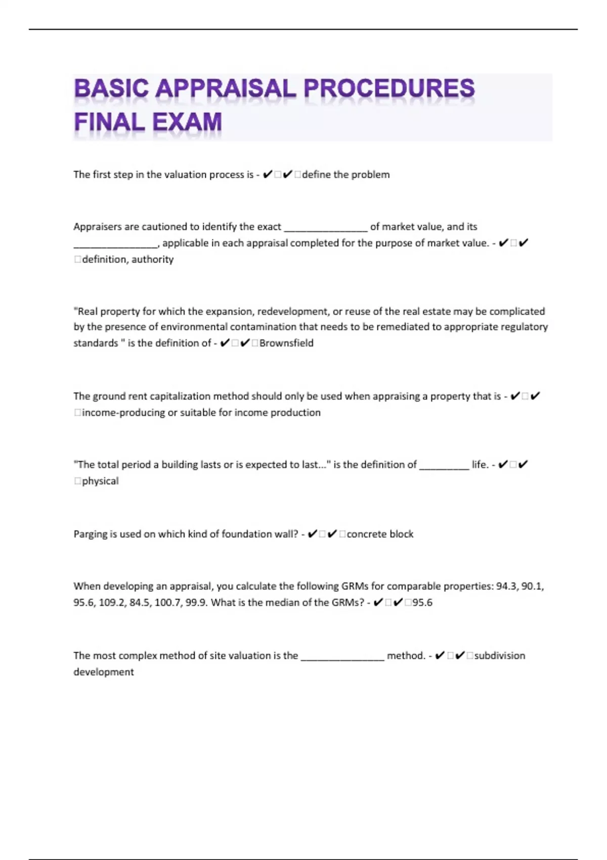 The first step in the valuation process is - ️️define the problem Appraisers are cautioned to identify the exact _______________ of market value, and its _______________, applicable in each appraisal completed for the purpose of market value. - ️️definition, authority "Real property for which the expansion, redevelopment, or reuse of the real estate may be complicated by the presence of environmental contamination that needs to be remediated to appropriate regulatory standards " is the definition of - ️️Brownsfield The ground rent capitalization method should only be used when appraising a property that is - ️️income-producing or suitable for income production "The total period a building lasts or is expected to last..." is the definition of _________ life. - ️️physical Parging is used on which kind of foundation wall? - ️️concrete block When developing an appraisal, you calculate the following GRMs for comparable properties: 94.3, 90.1, 95.6, 109.2, 84.5, 100.7, 99.9. What is the median of the GRMs? - ️️95.6 The most complex method of site valuation is the _______________ method. - ️️subdivision development