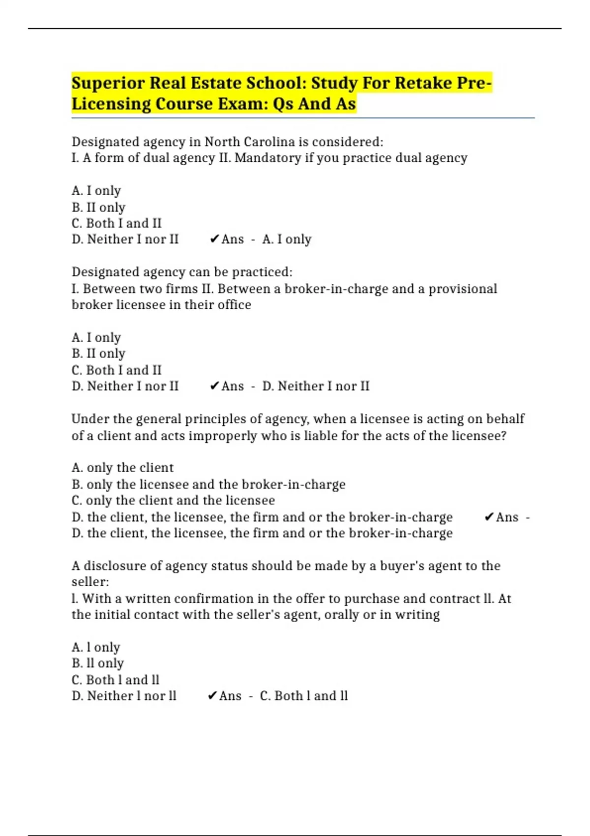 Superior Real Estate School: Study For Retake Pre-Licensing Course Exam: Qs And As