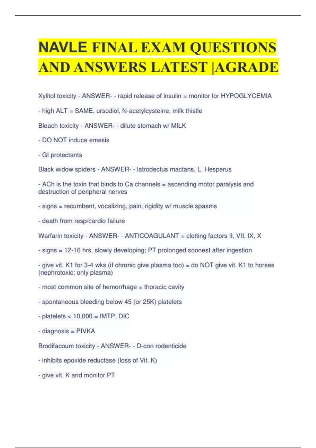 NAVLE FINAL EXAM QUESTIONS AND ANSWERS LATEST |AGRADE Xylitol toxicity - ANSWER- - rapid release of insulin = monitor for HYPOGLYCEMIA - high ALT = SAME, ursodiol, N-acetylcysteine, milk thistle Bleach toxicity - ANSWER- - dilute stomach w/ MILK - DO NOT induce emesis - GI protectants Black widow spiders - ANSWER- - latrodectus mactans, L. Hesperus - ACh is the toxin that binds to Ca channels = ascending motor paralysis and destruction of peripheral nerves - signs = recumbent, vocalizing, pain, rigidity w/ muscle spasms - death from resp/cardio failure Warfarin toxicity - ANSWER- - ANTICOAGULANT = clotting factors II, VII, IX, X - signs = 12-16 hrs, slowly developing; PT prolonged soonest after ingestion - give vit. K1 for 3-4 wks (if chronic give plasma too) = do NOT give vit. K1 to horses (nephrotoxic; only plasma) - most common site of hemorrhage = thoracic cavity - spontaneous bleeding below 45 (or 25K) platelets - platelets < 10,000 = IMTP, DIC - diagnosis = PIVKA Brodifacoum toxicity - ANSWER- - D-con rodenticide - inhibits epoxide reductase (loss of Vit. K) - give vit. K and monitor PT Bromethalin toxicity - ANSWER- - seizures - low dose = paralysis - high dose = convulsions Cholecalciferol toxicity - ANSWER- - converted to active Vit. D = increased resorption of calcium and gut absorption - can lead to fatal hypercalcemia + hyperphosphatemia = tissue mineralization - tx = phosphate binders (aluminum hydroxide, bisphosphonates, fluids (NaCl)), prednisone/prednisolone (decrease osteoclastic activity) - DO NOT give sulfa drugs = potentiate toxicity - human Vit. D supplements are high in Ca and P! Strychnine toxicity - ANSWER- tetanic seizures Zinc oxide - ANSWER- - gas - decontaminate = don't breathe in! Ethylene glycol - ANSWER- - always isosthenuric in stage 1/2 = ethanol (osmotic diuretic) - crystals don't tell you about stage = present all the time - stage 1 = ethanol, acidosis (CNS depression, V/D, ataxia, severe metabolic acidosis) - stage 2 = less depression, still acidotic, tachypnea - stage 3 = azotemia, casts, protein in urine --> treat renal dz - dx = high anion gap, azotemia, calcium oxalate crystalluria, metabolic acidosis, hyperglycemia, PU/PD or oliguria, hypocalcemia - tx = aimed at alcohol dehydrogenase - give 4-methylpyrazole (4-MP, fomepazole) --> effective 6-8 hrs post ingestion (best within 3); DOES NOT WORK ON CATS; ethanol competes Organophosphate toxicity - ANSWER- - inhibit acetylcholinesterase = muscarinic signs - DUMBSLED - tx = atropine or 2-PAM - DO NOT sedate w/ acepromazine Fleet enema toxicity - ANSWER- - high in phosphorus = decrease in serum calcium - hypernatremia and hyperphosphatemia - hypocalcemia --> weakness, shock, tremors, seizures - tx = calcium gluconate, phosphorus binders, insulin and dextrose (if hyperkalemic) Strychnine (snail bait) toxicity - ANSWER- - competitively antagonizes glycine = loss of impulse contractility in spinal cord and brainstem - affects striated muscle - tx = methocarbamol (for convulsions), prevent stimulation Chocolate toxicity - ANSWER- - methylxanthines (theobromine, caffeine) - CNS excitation, tachycardia