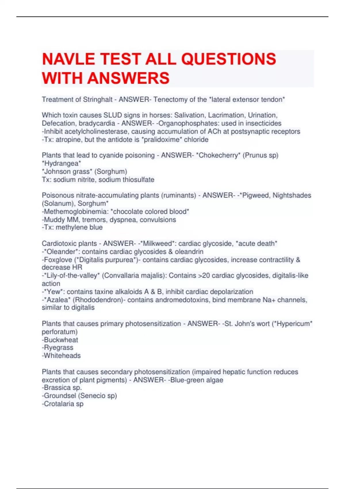 NAVLE TEST ALL QUESTIONS WITH ANSWERS Treatment of Stringhalt - ANSWER- Tenectomy of the *lateral extensor tendon* Which toxin causes SLUD signs in horses: Salivation, Lacrimation, Urination, Defecation, bradycardia - ANSWER- -Organophosphates: used in insecticides -Inhibit acetylcholinesterase, causing accumulation of ACh at postsynaptic receptors -Tx: atropine, but the antidote is *pralidoxime* chloride Plants that lead to cyanide poisoning - ANSWER- *Chokecherry* (Prunus sp) *Hydrangea* *Johnson grass* (Sorghum) Tx: sodium nitrite, sodium thiosulfate Poisonous nitrate-accumulating plants (ruminants) - ANSWER- -*Pigweed, Nightshades (Solanum), Sorghum* -Methemoglobinemia: *chocolate colored blood* -Muddy MM, tremors, dyspnea, convulsions -Tx: methylene blue Cardiotoxic plants - ANSWER- -*Milkweed*: cardiac glycoside, *acute death* -*Oleander*: contains cardiac glycosides & oleandrin -Foxglove (*Digitalis purpurea*)- contains cardiac glycosides, increase contractility & decrease HR -*Lily-of-the-valley* (Convallaria majalis): Contains >20 cardiac glycosides, digitalis-like action -*Yew*: contains taxine alkaloids A & B, inhibit cardiac depolarization -*Azalea* (Rhododendron)- contains andromedotoxins, bind membrane Na+ channels, similar to digitalis Plants that causes primary photosensitization - ANSWER- -St. John's wort (*Hypericum* perforatum) -Buckwheat -Ryegrass -Whiteheads Plants that causes secondary photosensitization (impaired hepatic function reduces excretion of plant pigments) - ANSWER- -Blue-green algae -Brassica sp. -Groundsel (Senecio sp) -Crotalaria sp -Amsinckia intermedia (aka fiddleneck, fireweed, tarweed): contains pyrrolizidine alkaloids This toxin can cause reproductive failure in horses - ANSWER- Fescue Most common bacterial pathogen of fish: furunculosis of salmonids, goldfish ulcer disease, carp erythrodermatitis, & trout ulcer disease - ANSWER- Aeromonas salmonicida Effects of Yellow Starthistle in horses - ANSWER- -Tremor of the lips and tongue -*Nigropallidal encephalomalacia*: marked dystonia of the facial muscles -Unable to prehend feed How can you determine a bitch's fertile period? - ANSWER- -4-7 days after LH peak -2-5 days after ovulation How can you predict a bitch's whelping date? - ANSWER- -65 days after LH peak -63 days after ovulation -57 days after 1st day of diestrus Methods of pregnancy diagnosis in dogs - ANSWER- -U/S at 20 days, mineralized > 45 days -Palpation starting at day 25-45 -*Relaxin* assay starting at day 25 (FP with early embryonic death)- only hormone strictly associated with pregnancy -Radiographs starting at 45 days Gullian-Barre syndrome is an acute demyelinating polyneuropathy of humans that has been associated with a foodborne illness & which agent? - ANSWER- Campylobacter jejuni Undercooked chicken & raw milk Clinical signs of cauda equina neuritis - ANSWER- -LMN signs, paresis, paralysis -Chewing the tail head -Hypotonic anus, fecal retention, urinary incontinence (urine scalding of thighs) -Hindlimb ataxia. Causative agent of *turkey* coryza - ANSWER- Bordetella avium- nasal discharge, foamy eyes, and cough Red clotted blood in the intestines of pigs at necropsy are pathognomonic for which condition? - ANSWER- -Proliferative hemorrhagic enteropathy -Caused by Lawsonia intracellularis Reversal drugs - ANSWER- -Atipamezole reverses Medetomidine (alpha-2 agonist) -Yohimbine reverses Xylazine (alpha-2 agonist) -2-pralidoxime (2PAM) reverses cholinesterase inhibitors -Flumazenil reverses benzodiazepines -Naloxone reverses opioids What disease does IV sodium Iodide treat? - ANSWER- -Controversial treatment of lumpy jaw (Actinomyces bovis) -Concerns that iodide may cause abortion -Contraindicated in pregnant or lactating cattle: food safety concerns When is anestrus typically in horses? - ANSWER- Winter Familial Shar Pei Fever - ANSWER- -High fever and tarsal swelling -May have normal synovial fluid cytology -Predisposed to *amyoloidosis*, resulting in *proteinuria* Which plants causes calves to be born with with cleft palates, arthrogryposis, and crooked spines? - ANSWER- Lupine Symmetrical ataxia, urin