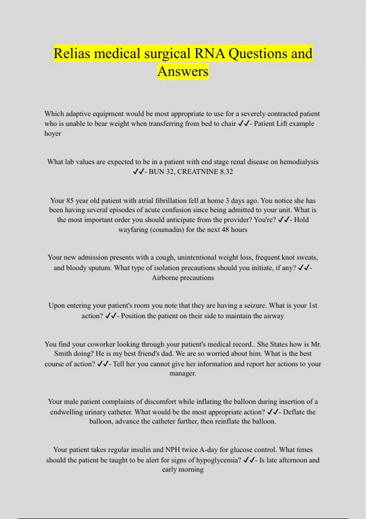 Which adaptive equipment would be most appropriate to use for a severely contracted patient who is unable to bear weight when transferring from bed to chair - Patient Lift example hoyer What lab values are expected to be in a patient with end stage renal disease on hemodialysis - BUN 32, CREATNINE 8.32 Your 85 year old patient with atrial fibrillation fell at home 3 days ago. You notice she has been having several episodes of acute confusion since being admitted to your unit. What is the most important order you should anticipate from the provider? You're? - Hold wayfaring (coumadin) for the next 48 hours Your new admission presents with a cough, unintentional weight loss, frequent knot sweats, and bloody sputum. What type of isolation precautions should you initiate, if any? - Airborne precautions Upon entering your patient's room you note that they are having a seizure. What is your 1st action? - Position the patient on their side to maintain the airway You find your coworker looking through your patient's medical record.. She States how is Mr. Smith doing? He is my best friend's dad. We are so worried about him. What is the best course of action? - Tell her you cannot give her information and report her actions to your manager. Your male patient complaints of discomfort while inflating the balloon during insertion of a endwelling urinary catheter. What would be the most appropriate action? - Deflate the balloon, advance the catheter further, then reinflate the balloon. Your patient takes regular insulin and NPH twice A-day for glucose control. What times should the patient be taught to be alert for signs of hypoglycemia? - Is late afternoon and early morning