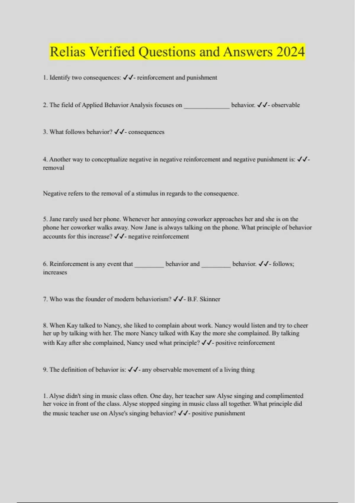 1. Identify two consequences: - reinforcement and punishment 2. The field of Applied Behavior Analysis focuses on ______________ behavior. - observable 3. What follows behavior? - consequences 4. Another way to conceptualize negative in negative reinforcement and negative punishment is: - removal Negative refers to the removal of a stimulus in regards to the consequence. 5. Jane rarely used her phone. Whenever her annoying coworker approaches her and she is on the phone her coworker walks away. Now Jane is always talking on the phone. What principle of behavior accounts for this increase? - negative reinforcement 6. Reinforcement is any event that _________ behavior and _________ behavior. - follows; increases 7. Who was the founder of modern behaviorism? - B.F. Skinner 8. When Kay talked to Nancy, she liked to complain about work. Nancy would listen and try to cheer her up by talking with her. The more Nancy talked with Kay the more she complained. By talking with Kay after she complained, Nancy used what principle? - positive reinforcement 9. The definition of behavior is: - any observable movement of a living thing 1. Alyse didn't sing in music class often. One day, her teacher saw Alyse singing and complimented her voice in front of the class. Alyse stopped singing in music class all together. What principle did the music teacher use on Alyse's singing behavior? - positive punishment