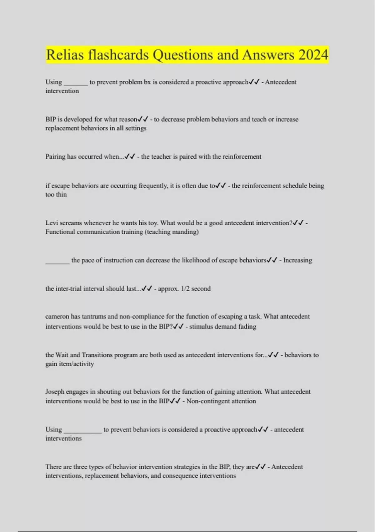 Using _______ to prevent problem bx is considered a proactive approach - Antecedent intervention BIP is developed for what reason - to decrease problem behaviors and teach or increase replacement behaviors in all settings Pairing has occurred when... - the teacher is paired with the reinforcement if escape behaviors are occurring frequently, it is often due to - the reinforcement schedule being too thin Levi screams whenever he wants his toy. What would be a good antecedent intervention? - Functional communication training (teaching manding) _______ the pace of instruction can decrease the likelihood of escape behaviors - Increasing the inter-trial interval should last... - approx. 1/2 second cameron has tantrums and non-compliance for the function of escaping a task. What antecedent interventions would be best to use in the BIP? - stimulus demand fading the Wait and Transitions program are both used as antecedent interventions for... - behaviors to gain item/activity Joseph engages in shouting out behaviors for the function of gaining attention. What antecedent interventions would be best to use in the BIP - Non-contingent attention Using ___________ to prevent behaviors is considered a proactive approach - antecedent interventions There are three types of behavior intervention strategies in the BIP, they are - Antecedent interventions, replacement behaviors, and consequence interventions