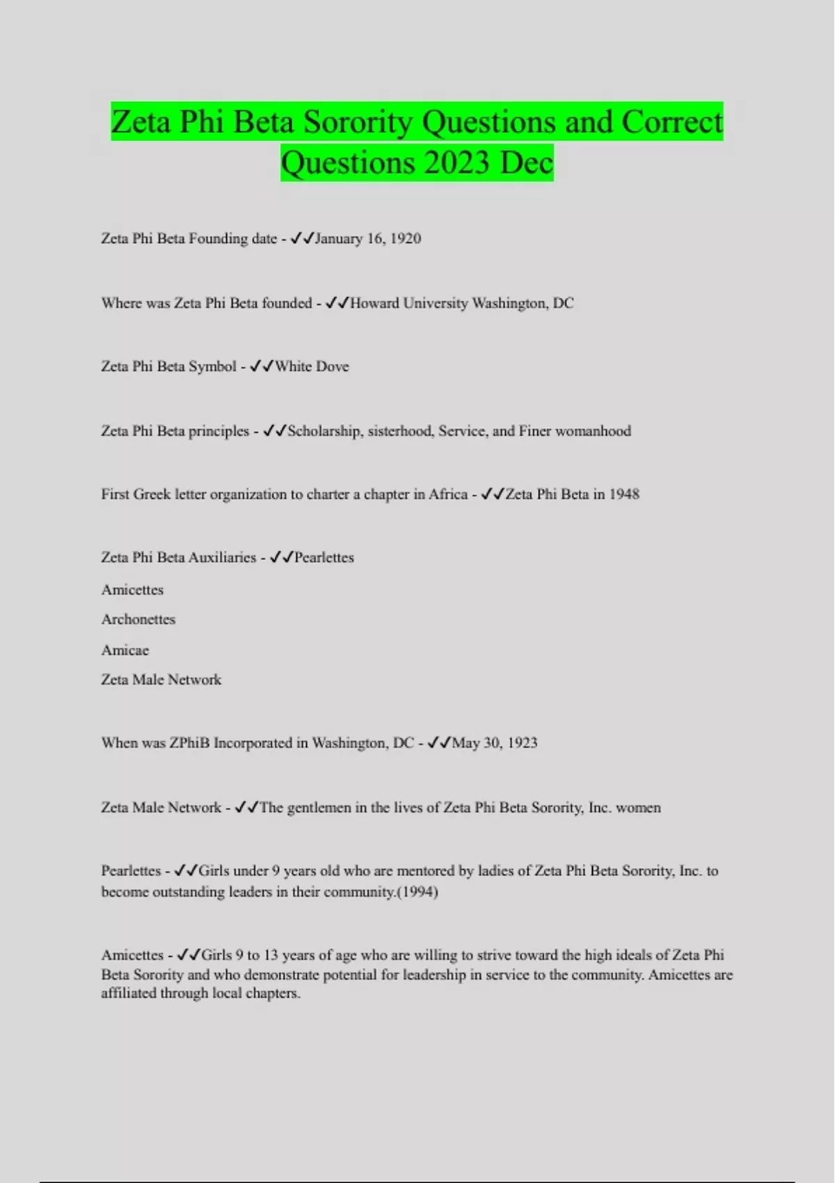 Zeta Phi Beta Sorority Questions and Correct Questions 2023 Dec