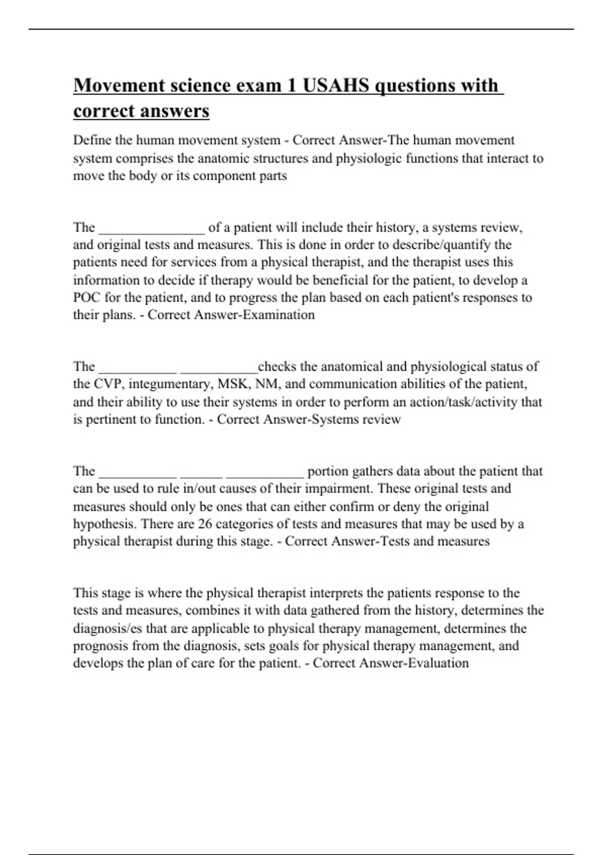 Define the human movement system - Correct Answer-The human movement system comprises the anatomic structures and physiologic functions that interact to move the body or its component parts The _______________ of a patient will include their history, a systems review, and original tests and measures. This is done in order to describe/quantify the patients need for services from a physical therapist, and the therapist uses this information to decide if therapy would be beneficial for the patient, to develop a POC for the patient, and to progress the plan based on each patient's responses to their plans. - Correct Answer-Examination The ___________ ___________checks the anatomical and physiological status of the CVP, integumentary, MSK, NM, and communication abilities of the patient, and their ability to use their systems in order to perform an action/task/activity that is pertinent to function. - Correct Answer-Systems review The ___________ ______ ___________ portion gathers data about the patient that can be used to rule in/out causes of their impairment. These original tests and measures should only be ones that can either confirm or deny the original hypothesis. There are 26 categories of tests and measures that may be used by a physical therapist during this stage. - Correct Answer-Tests and measures This stage is where the physical therapist interprets the patients response to the tests and measures, combines it with data gathered from the history, determines the diagnosis/es that are applicable to physical therapy management, determines the prognosis from the diagnosis, sets goals for physical therapy management, and develops the plan of care for the patient. - Correct Answer-Evaluation _____________ occur not only at the start of care