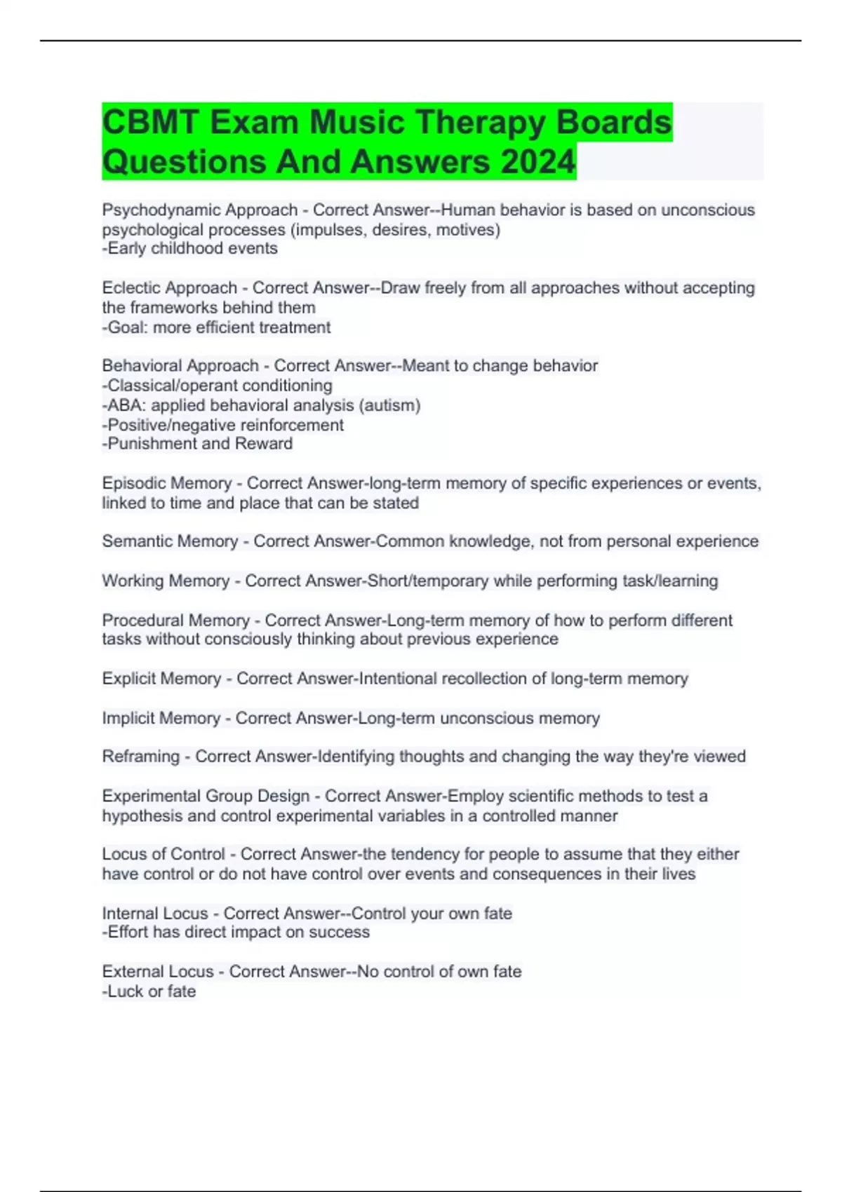 CBMT Exam Music Therapy Boards Questions And Answers 2024