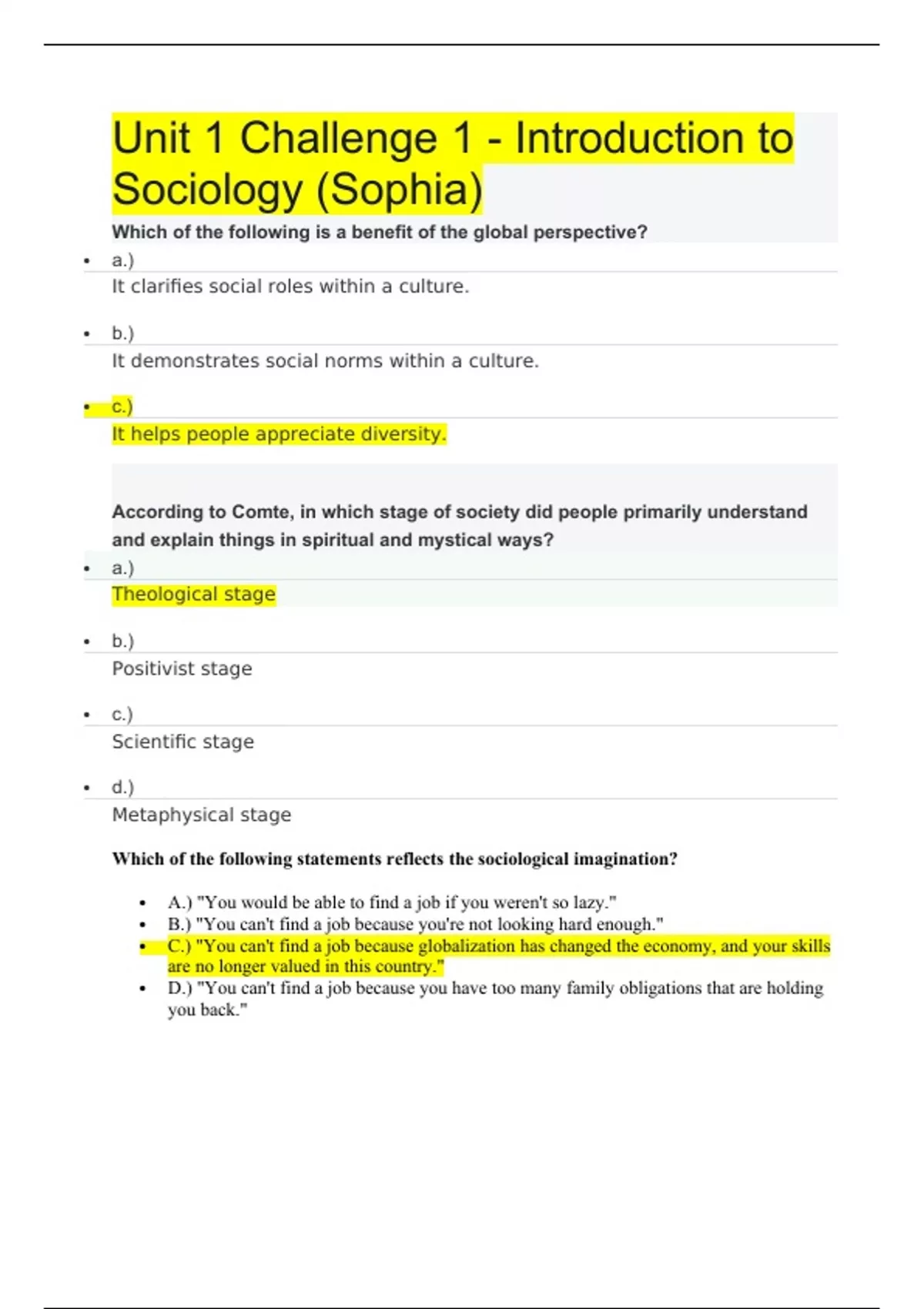 Unit 1 Challenge 1 - Introduction to Sociology (Sophia) Which of the following is a benefit of the global perspective? • a.) It clarifies social roles within a culture. • b.) It demonstrates social norms within a culture. • c.) It helps people appreciate diversity. According to Comte, in which stage of society did people primarily understand and explain things in spiritual and mystical ways? • a.) Theological stage • b.) Positivist stage • c.) Scientific stage • d.) Metaphysical stage Which of the following statements reflects the sociological imagination? • A.) "You would be able to find a job if you weren't so lazy." • B.) "You can't find a job because you're not looking hard enough." • C.) "You can't find a job because globalization has changed the economy, and your skills are no longer valued in this country." • D.) "You can't find a job because you have too many family obligations that are holding you back."