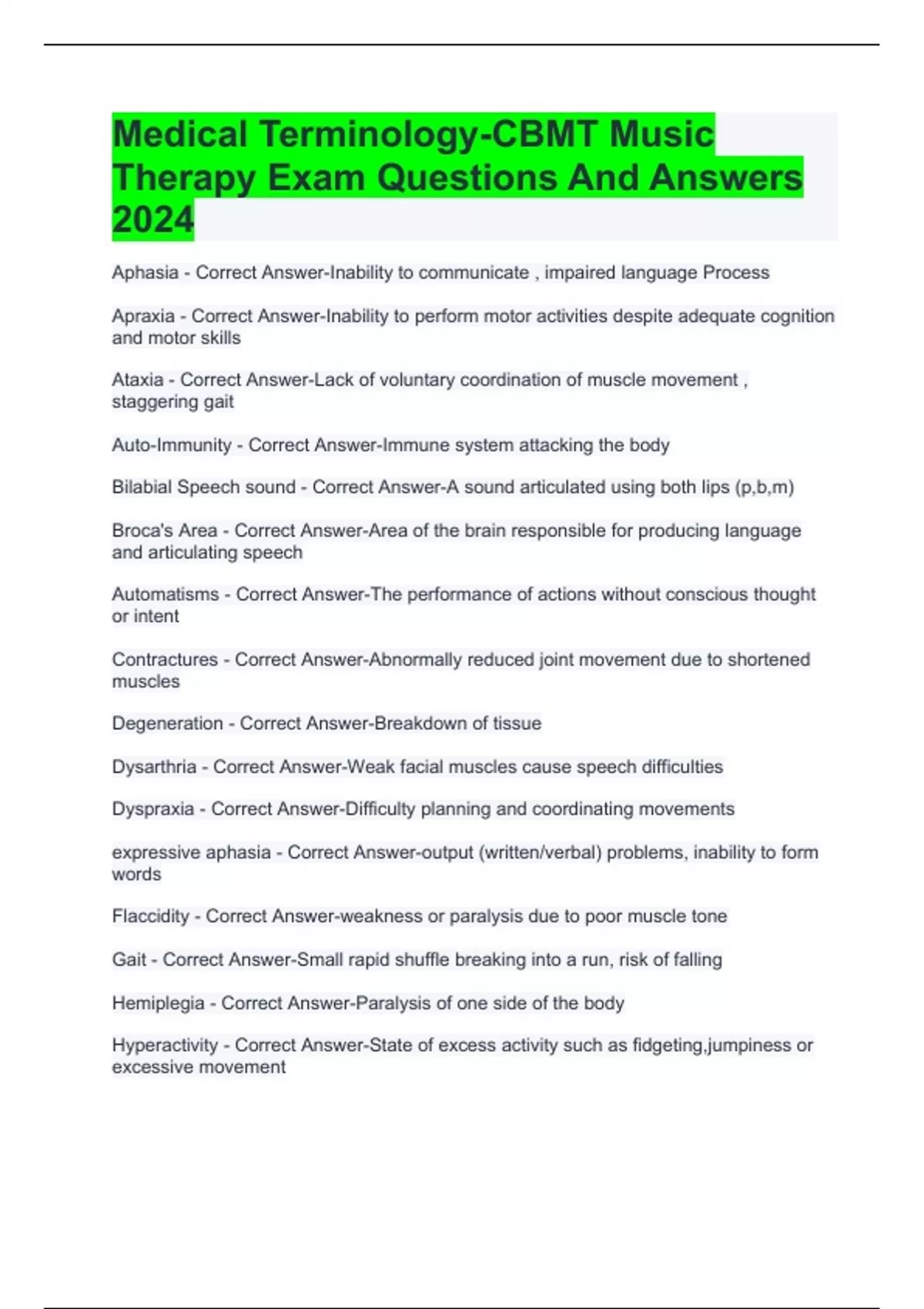 Medical Terminology-CBMT Music Therapy Exam Questions And Answers 2024