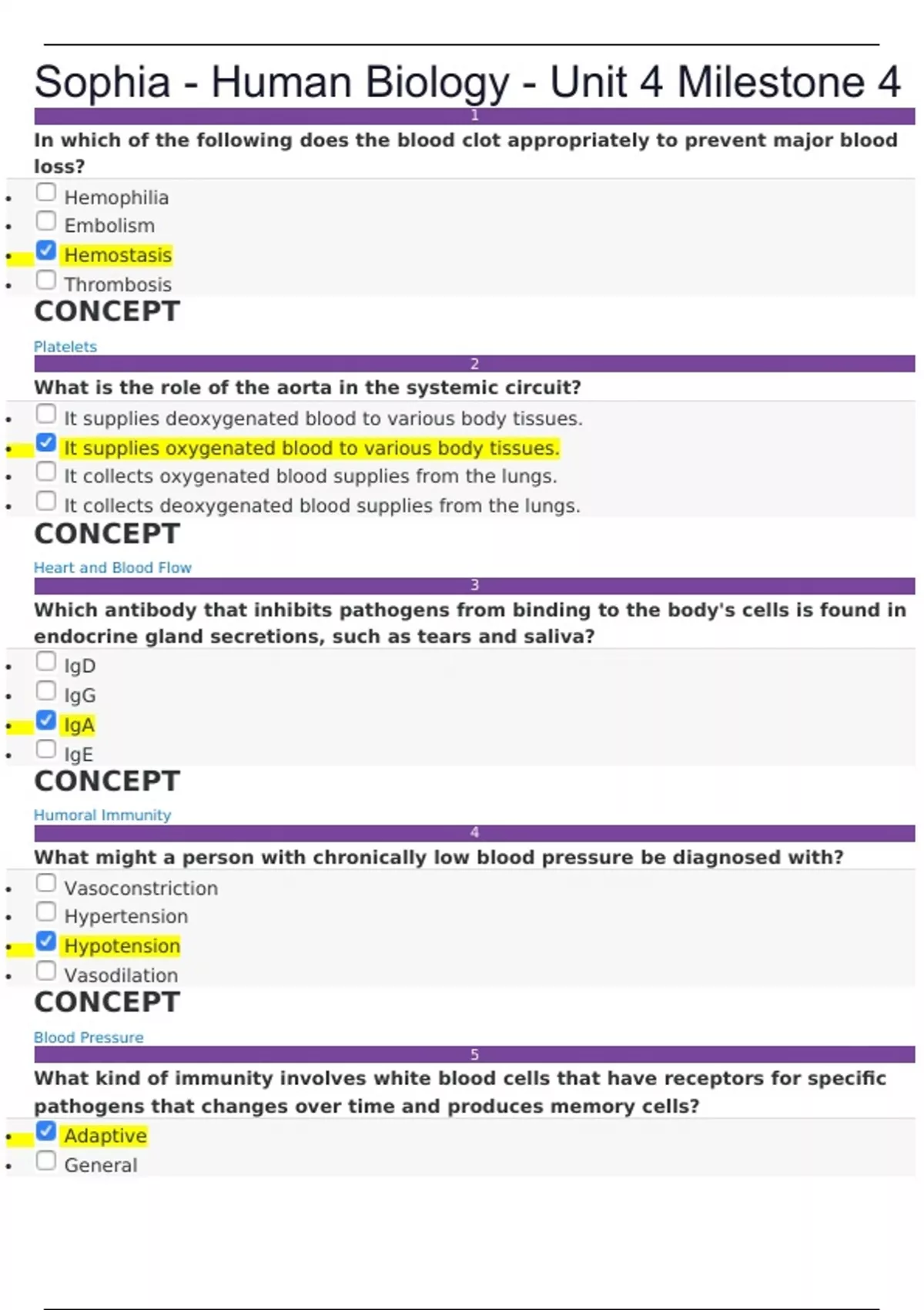 In which of the following does the blood clot appropriately to prevent major blood loss? • Hemophilia • Embolism • Hemostasis • Thrombosis CONCEPT Platelets 2 What is the role of the aorta in the systemic circuit? • It supplies deoxygenated blood to various body tissues. • It supplies oxygenated blood to various body tissues. • It collects oxygenated blood supplies from the lungs. • It collects deoxygenated blood supplies from the lungs. CONCEPT Heart and Blood Flow 3 Which antibody that inhibits pathogens from binding to the body's cells is found in endocrine gland secretions, such as tears and saliva? • IgD • IgG • IgA • IgE CONCEPT Humoral Immunity 4 What might a person with chronically low blood pressure be diagnosed with? • Vasoconstriction • Hypertension • Hypotension • Vasodilation CONCEPT Blood Pressure 5 What kind of immunity involves white blood cells that have receptors for specific pathogens that changes over time and produces memory cells? • Adaptive • General • Pathogenic • Innate CONCEPT Pathogens 6 Which type of white blood cell attacks other unhealthy cells? • Monocytes • Eosinophils • Basophils • Lymphocytes CONCEPT White Blood Cells 7 What are the antibodies found in blood type B? • Anti-B • Neither anti-A nor anti-B • Anti-A and Anti-B • Anti-A CONCEPT Blood Types 8 If a transplanted organ's MHC cells don't match those of the recipient, what will happen? • The organ will change its MHC cells so as to be recognized by the recipient's immune system. • The recipient's body will block off the new organ and it won't function normally. • The recipient's immune system will change the MHC markers on the organ so that it won't be identified as an intruder. • The recipient's immune system will identify the transplanted organ as an intruder and attack it. CONCEPT Organ Transplant and Immunotherapy 9 Which of the following statements about vaccines is true? • A vaccine prompts the body's T-cells to produce antibodies against the virus. • Vaccines are non-specific, meaning they protect against a variety of viruses or illnesses. • Booster shots are a type of secondary vaccine that allow for longer lasting protection against a particular virus. • Vaccines are used against viruses, bacteria and fungal infections. CONCEPT Vaccines 10 What muscular tubes, not supported by cartilage, help regulate airflow into and out of the lungs? • Diaphragm