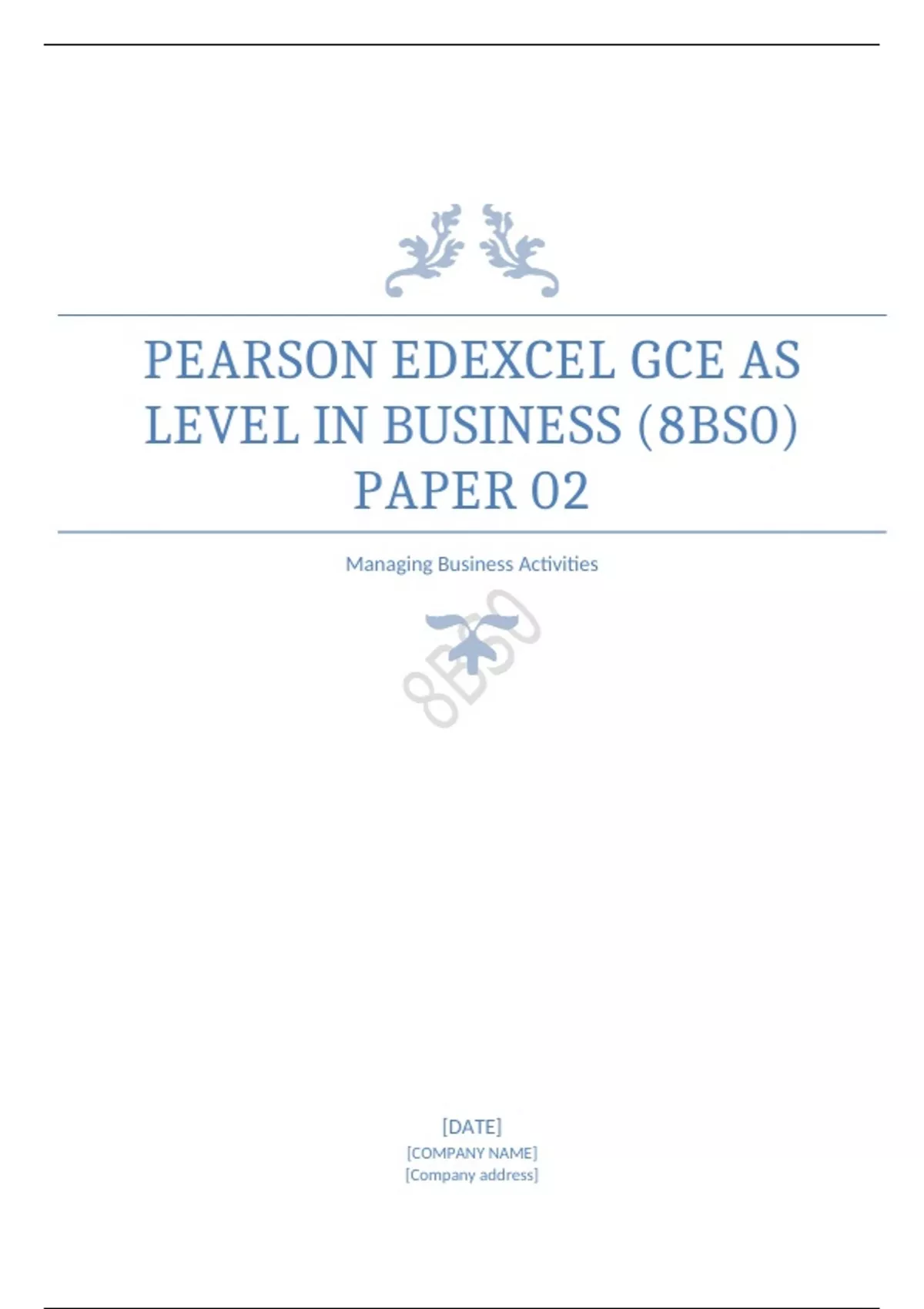 PEARSON EDEXCEL GCE AS LEVEL IN BUSINESS (8BS0) PAPER 02 Managing Business Activities