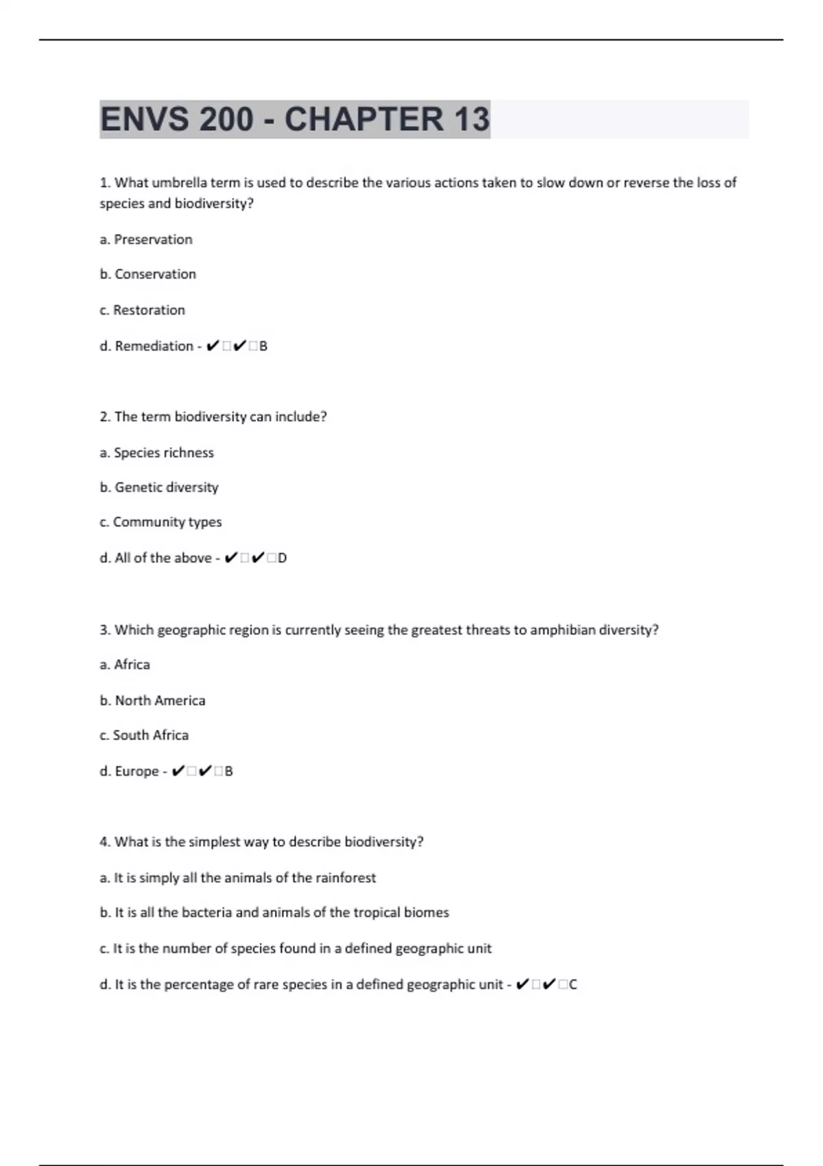 1. What umbrella term is used to describe the various actions taken to slow down or reverse the loss of species and biodiversity? a. Preservation b. Conservation c. Restoration d. Remediation - ️️B 2. The term biodiversity can include? a. Species richness b. Genetic diversity c. Community types d. All of the above - ️️D 3. Which geographic region is currently seeing the greatest threats to amphibian diversity? a. Africa b. North America c. South Africa d. Europe - ️️B 4. What is the simplest way to describe biodiversity? a. It is simply all the animals of the rainforest b. It is all the bacteria and animals of the tropical biomes c. It is the number of species found in a defined geographic unit d. It is the percentage of rare species in a defined geographic unit - ️️C