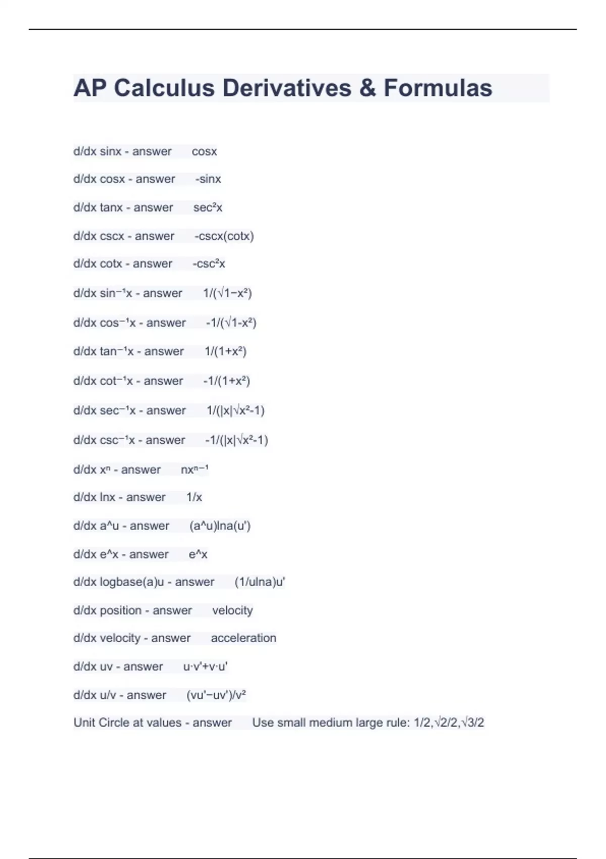 AP Calculus Derivatives & Formulas