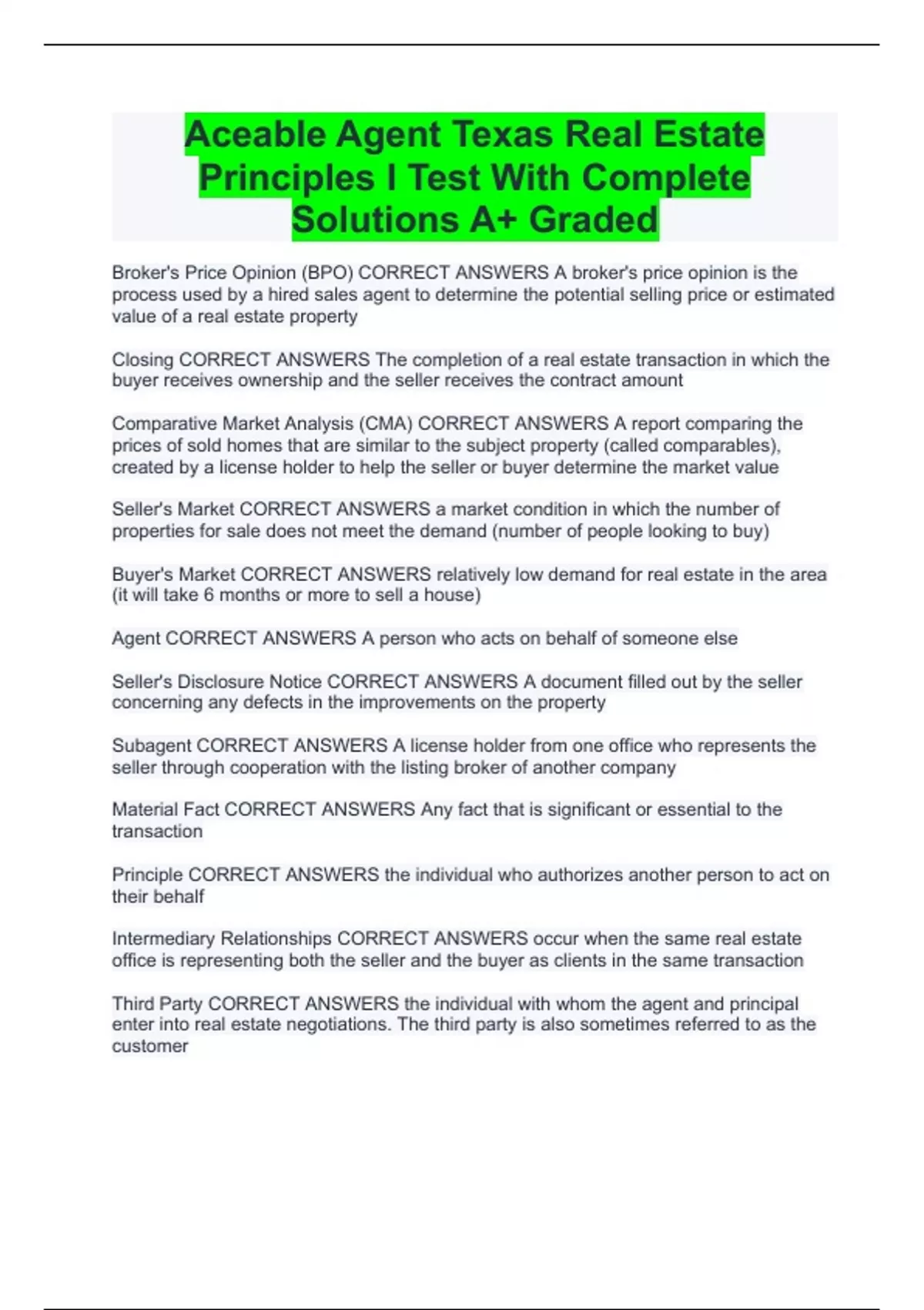 Aceable Agent Texas Real Estate Principles I Test With Complete Solutions A+ Graded