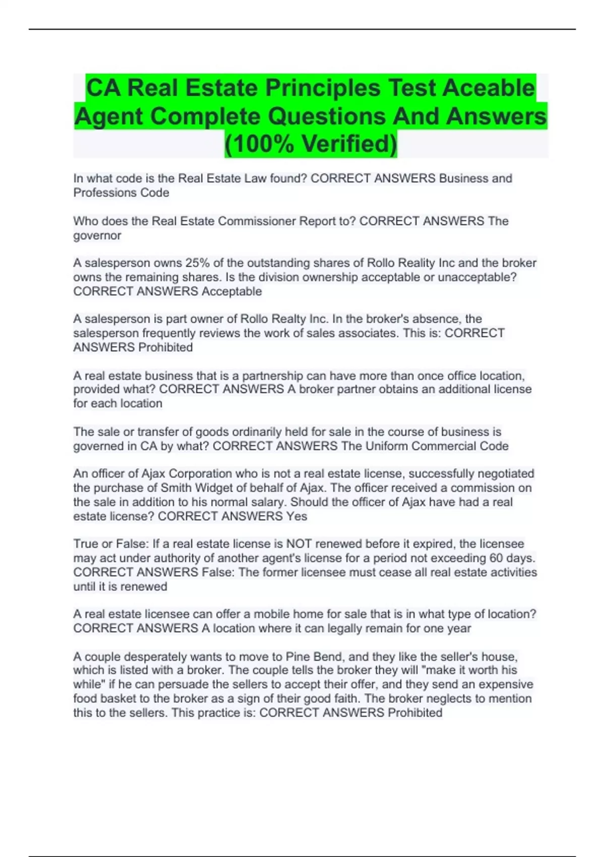CA Real Estate Principles Test Aceable Agent Complete Questions And Answers (100% Verified)
