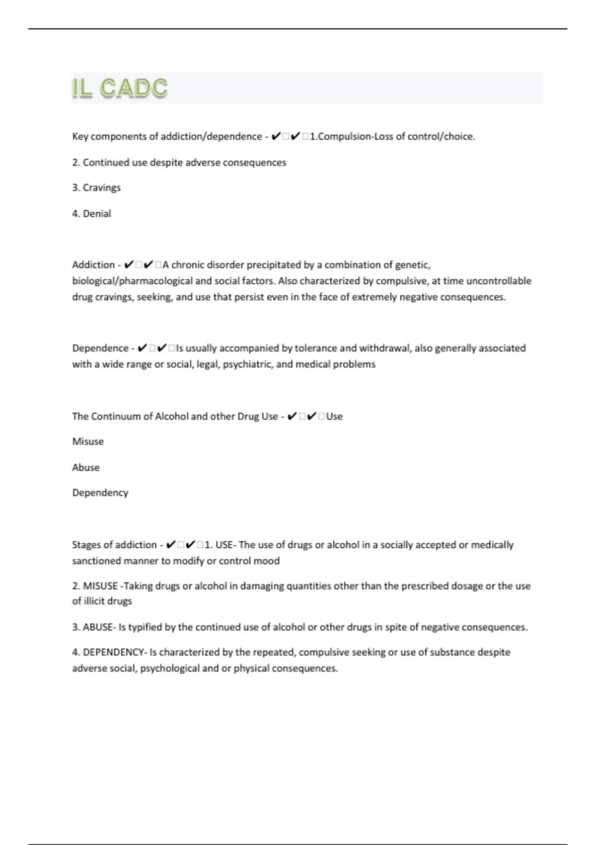 Key components of addiction/dependence - ️️1.Compulsion-Loss of control/choice. 2. Continued use despite adverse consequences 3. Cravings 4. Denial Addiction - ️️A chronic disorder precipitated by a combination of genetic, biological/pharmacological and social factors. Also characterized by compulsive, at time uncontrollable drug cravings, seeking, and use that persist even in the face of extremely negative consequences. Dependence - ️️Is usually accompanied by tolerance and withdrawal, also generally associated with a wide range or social, legal, psychiatric, and medical problems The Continuum of Alcohol and other Drug Use - ️️Use Misuse Abuse Dependency Stages of addiction - ️️1. USE- The use of drugs or alcohol in a socially accepted or medically sanctioned manner to modify or control mood 2. MISUSE -Taking drugs or alcohol in damaging quantities other than the prescribed dosage or the use of illicit drugs 3. ABUSE- Is typified by the continued use of alcohol or other drugs in spite of negative consequences. 4. DEPENDENCY- Is characterized by the repeated, compulsive seeking or use of substance despite adverse social, psychological and or physical consequences.
