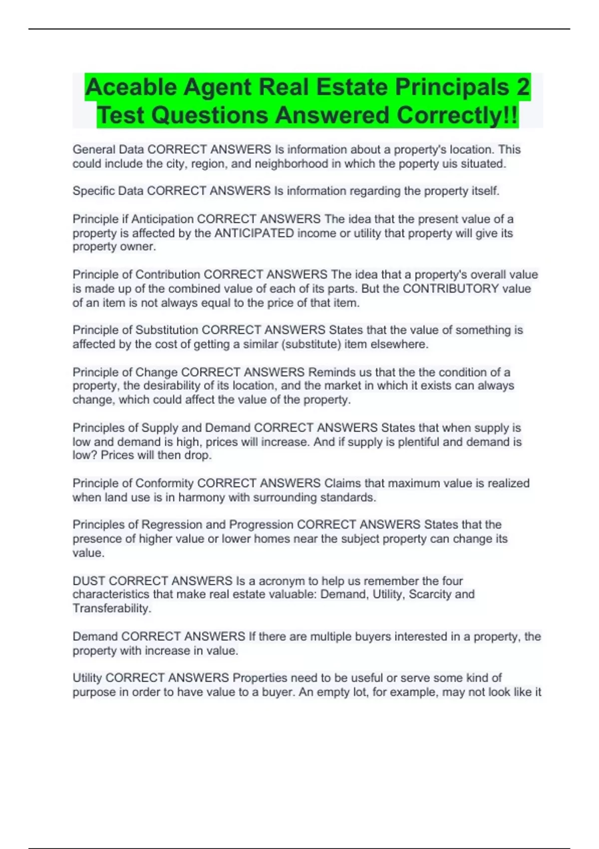 Aceable Agent Real Estate Principals 2 Test Questions Answered Correctly!!