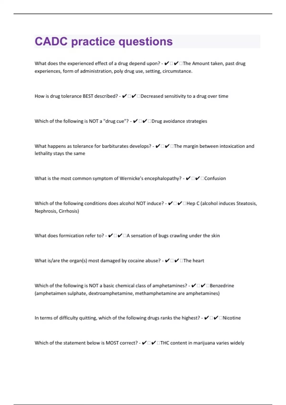 What does the experienced effect of a drug depend upon? - ️️The Amount taken, past drug experiences, form of administration, poly drug use, setting, circumstance. How is drug tolerance BEST described? - ️️Decreased sensitivity to a drug over time Which of the following is NOT a "drug cue"? - ️️Drug avoidance strategies What happens as tolerance for barbiturates develops? - ️️The margin between intoxication and lethality stays the same What is the most common symptom of Wernicke's encephalopathy? - ️️Confusion Which of the following conditions does alcohol NOT induce? - ️️Hep C (alcohol induces Steatosis, Nephrosis, Cirrhosis) What does formication refer to? - ️️A sensation of bugs crawling under the skin What is/are the organ(s) most damaged by cocaine abuse? - ️️The heart Which of the following is NOT a basic chemical class of amphetamines? - ️️Benzedrine (amphetaimen sulphate, dextroamphetamine, methamphetamine are amphetamines) In terms of difficulty quitting, which of the following drugs ranks the highest? - ️️Nicotine Which of the statement below is MOST correct? - ️️THC content in marijuana varies widely
