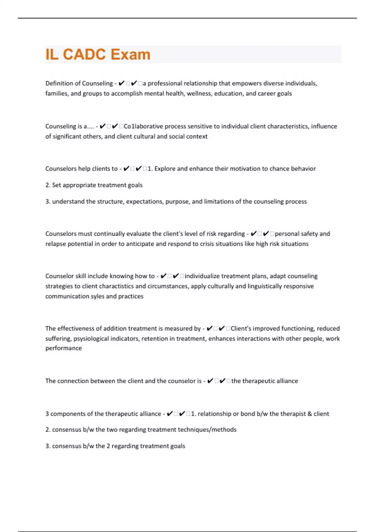 Definition of Counseling - ️️a professional relationship that empowers diverse individuals, families, and groups to accomplish mental health, wellness, education, and career goals Counseling is a.... - ️️Co1laborative process sensitive to individual client characteristics, influence of significant others, and client cultural and social context Counselors help clients to - ️️1. Explore and enhance their motivation to chance behavior 2. Set appropriate treatment goals 3. understand the structure, expectations, purpose, and limitations of the counseling process Counselors must continually evaluate the client's level of risk regarding - ️️personal safety and relapse potential in order to anticipate and respond to crisis situations like high risk situations Counselor skill include knowing how to - ️️individualize treatment plans, adapt counseling strategies to client charactistics and circumstances, apply culturally and linguistically responsive communication syles and practices The effectiveness of addition treatment is measured by - ️️Client's improved functioning, reduced suffering, psysiological indicators, retention in treatment, enhances interactions with other people, work performance The connection between the client and the counselor is - ️️the therapeutic alliance 3 components of the therapeutic alliance - ️️1. relationship or bond b/w the therapist & client 2. consensus b/w the two regarding treatment techniques/methods 3. consensus b/w the 2 regarding treatment goals