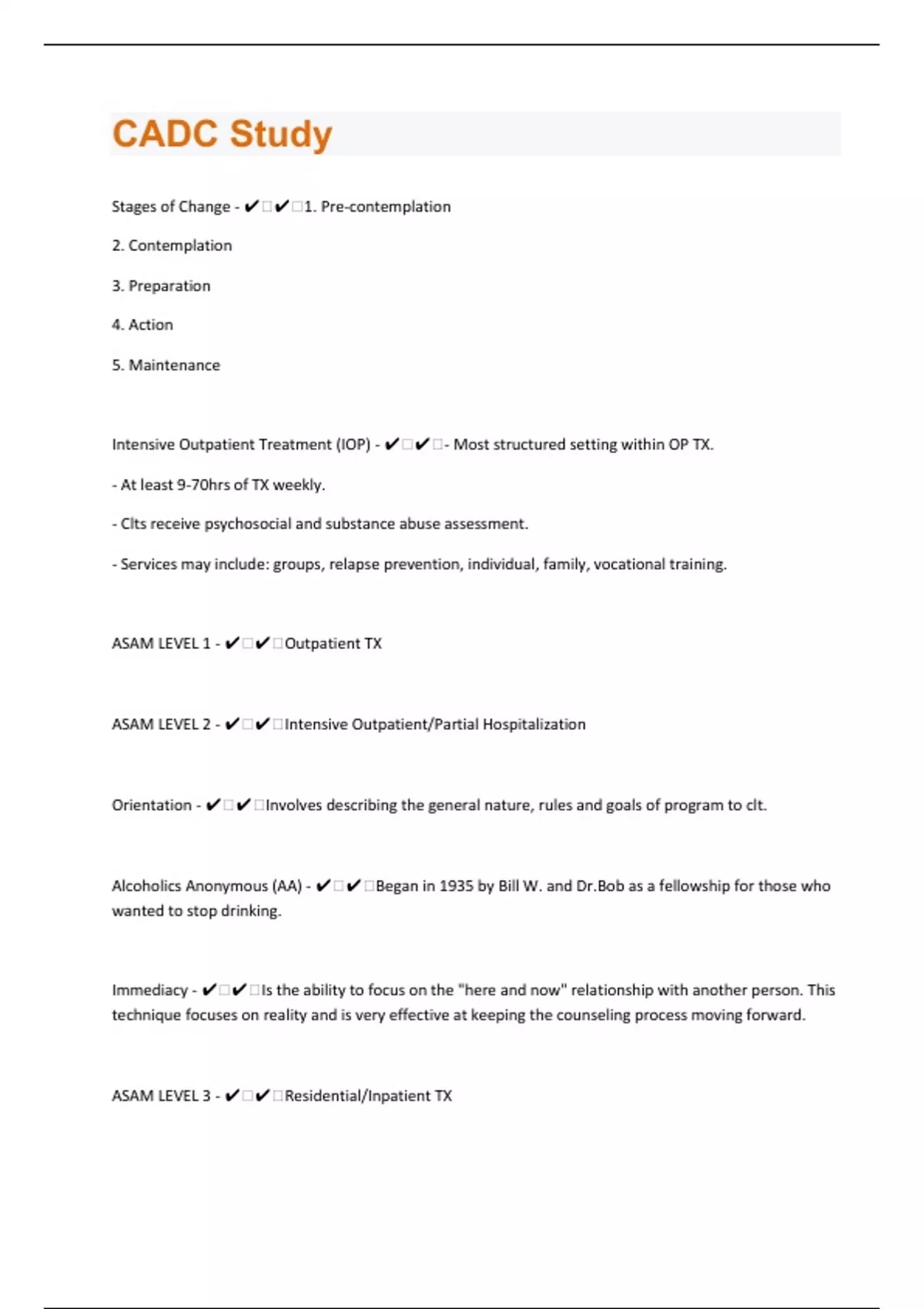Stages of Change - ️️1. Pre-contemplation 2. Contemplation 3. Preparation 4. Action 5. Maintenance Intensive Outpatient Treatment (IOP) - ️️- Most structured setting within OP TX. - At least 9-70hrs of TX weekly. - Clts receive psychosocial and substance abuse assessment. - Services may include: groups, relapse prevention, individual, family, vocational training. ASAM LEVEL 1 - ️️Outpatient TX ASAM LEVEL 2 - ️️Intensive Outpatient/Partial Hospitalization Orientation - ️️Involves describing the general nature, rules and goals of program to clt. Alcoholics Anonymous (AA) - ️️Began in 1935 by Bill W. and Dr.Bob as a fellowship for those who wanted to stop drinking. Immediacy - ️️Is the ability to focus on the "here and now" relationship with another person. This technique focuses on reality and is very effective at keeping the counseling process moving forward. ASAM LEVEL 3 - ️️Residential/Inpatient TX