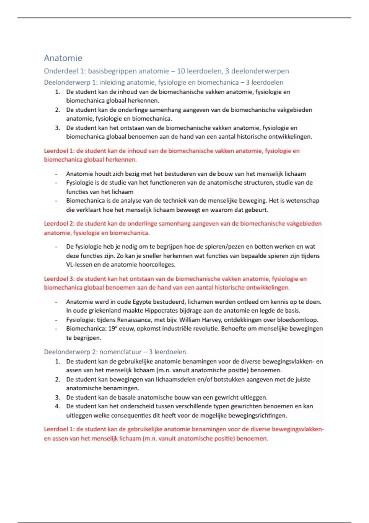 Leerdoel 1: de student kan de inhoud van de biomechanische vakken anatomie, fysiologie en