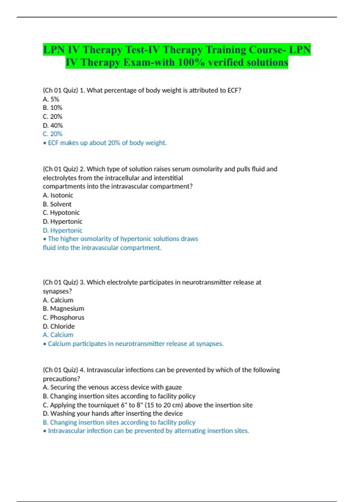 LPN IV Therapy Test-IV Therapy Training Course- LPN IV Therapy Exam-with 100% verified solutions