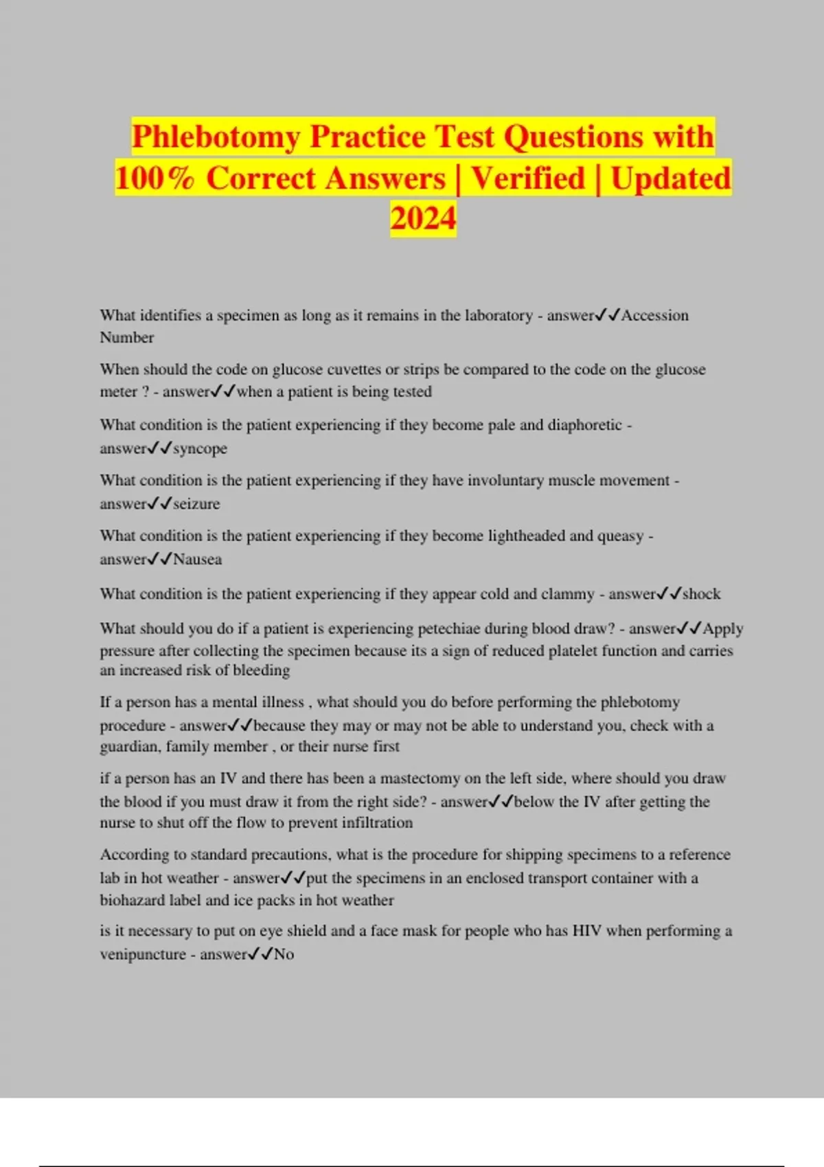 Phlebotomy Practice Test Questions with 100% Correct Answers | Verified | Updated 2024 What identifies a specimen as long as it remains in the laboratory - answerAccession Number When should the code on glucose cuvettes or strips be compared to the code on the glucose meter ? - answerwhen a patient is being tested What condition is the patient experiencing if they become pale and diaphoretic - answersyncope What condition is the patient experiencing if they have involuntary muscle movement - answerseizure What condition is the patient experiencing if they become lightheaded and queasy - answerNausea What condition is the patient experiencing if they appear cold and clammy - answershock What should you do if a patient is experiencing petechiae during blood draw? - answerApply pressure after collecting the specimen because its a sign of reduced platelet function and carries an increased risk of bleeding If a person has a mental illness , what should you do before performing the phlebotomy procedure - answerbecause they may or may not be able to understand you, check with a guardian, family member , or their nurse first if a person has an IV and there has been a mastectomy on the left side, where should you draw the blood if you must draw it from the right side? - answerbelow the IV after getting the nurse to shut off the flow to prevent infiltration According to standard precautions, what is the procedure for shipping specimens to a reference lab in hot weather - answerput the specimens in an enclosed transport container with a biohazard label and ice packs in hot weather is it necessary to put on eye shield and a face mask for people who has HIV when performing a venipuncture - answerNo