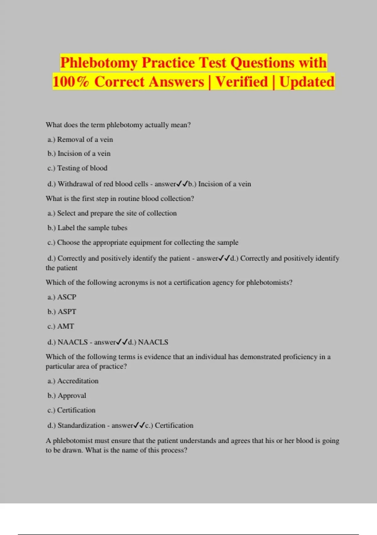 Phlebotomy Practice Test Questions with 100% Correct Answers | Verified | Updated What does the term phlebotomy actually mean? a.) Removal of a vein b.) Incision of a vein c.) Testing of blood d.) Withdrawal of red blood cells - answerb.) Incision of a vein What is the first step in routine blood collection? a.) Select and prepare the site of collection b.) Label the sample tubes c.) Choose the appropriate equipment for collecting the sample d.) Correctly and positively identify the patient - answerd.) Correctly and positively identify the patient Which of the following acronyms is not a certification agency for phlebotomists? a.) ASCP b.) ASPT c.) AMT d.) NAACLS - answerd.) NAACLS Which of the following terms is evidence that an individual has demonstrated proficiency in a particular area of practice? a.) Accreditation b.) Approval c.) Certification d.) Standardization - answerc.) Certification A phlebotomist must ensure that the patient understands and agrees that his or her blood is going to be drawn. What is the name of this process? a.) Confidentiality b.) Informed consent c.) Legality d.) Privacy - answerb.) Informed consent The Health Insurance Portability and Accountability Act of 1996 regulates which of the following areas? a.) Privacy of health information b.) Health insurance transfers on changing jobs c.) Informing patients of intended procedures d.) Phlebotomy training - answera.) Privacy of health information You have entered a patient's room and explained that you need to draw blood, and the patient repeatedly refuses. What should you do? a.) Attempt to draw anyhow because the physician ordered the test b.) Call for another phlebotomist to help you convince the patient c.) Take the request form back to laboratory after you have finished drawing your other patients d.) Notify the patient's physician according to the institution's written policies - answerd.) Notify the patient's physician according to the institution's written policies The term informed consent means: a.) A patient must be informed of all intended treatments and risks before the treatment is performed. b.) A patient must inform the physicians concerning what procedures they need. c.) A nurse informed by the phlebotomist can overrule a patient's refusal. d.) As long as the patient is informed, he or she cannot refuse a treatment. - answera.) A patient must be informed of all intended treatments and risks before the treatment is performed. Which of the following is true? a.) Phlebotomy is an ancient profession dating back at least 3500 years. b.) Phlebotomy is a new profession arising during World War II. c.) Phlebotomists today draw blood from patients for the same reasons as ancient phlebotomists. d.) Phlebotomy equipment has not changed since the original phlebotomists. - answera.) Phlebotomy is an ancient profession dating back at lea